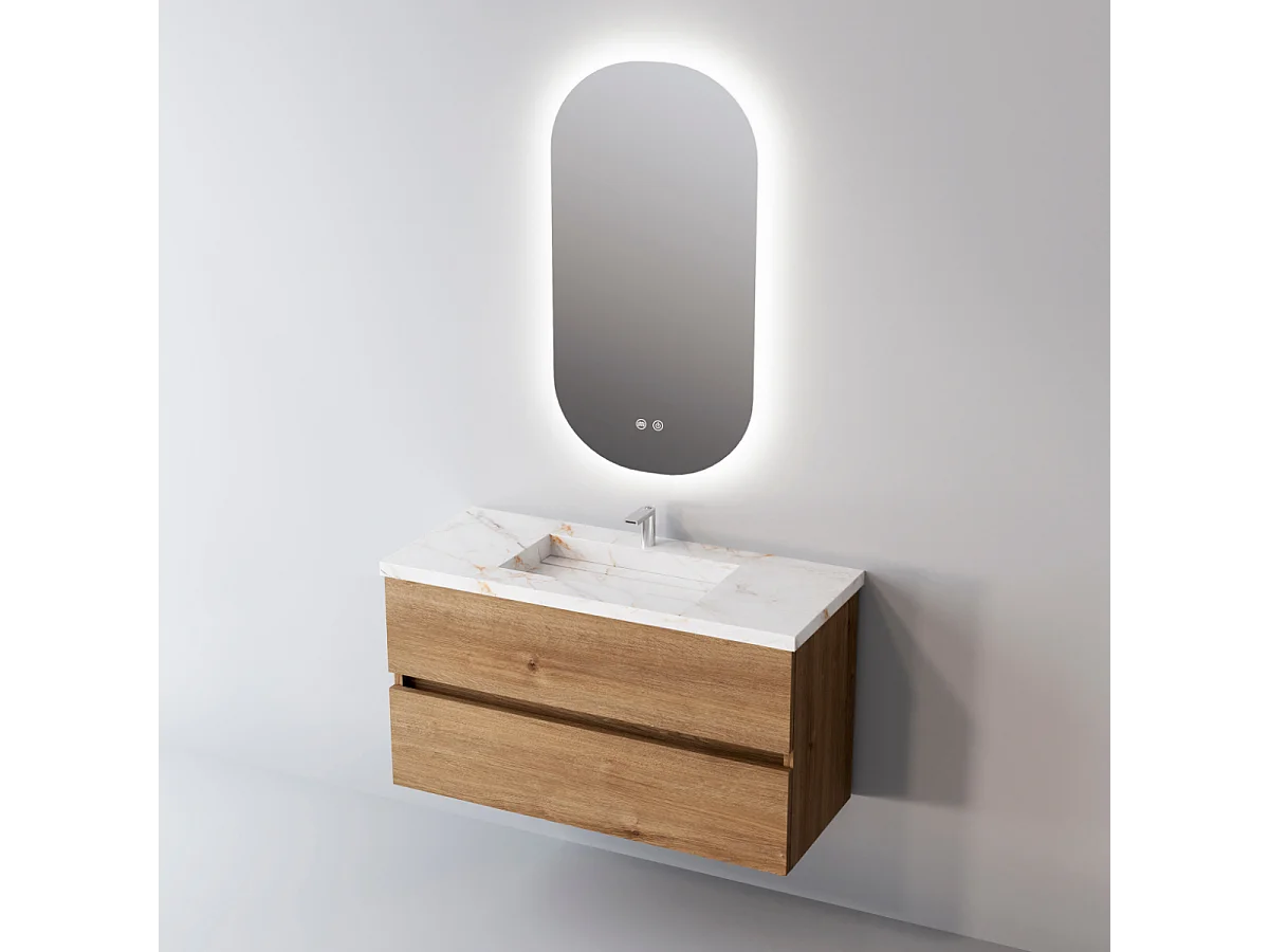 Meuble Salle de Bain ANCONA (101 cm x H54 x P45 cm), Plan Vasque Grès Cérame BS, 2 Tiroirs, Chêne Naturel