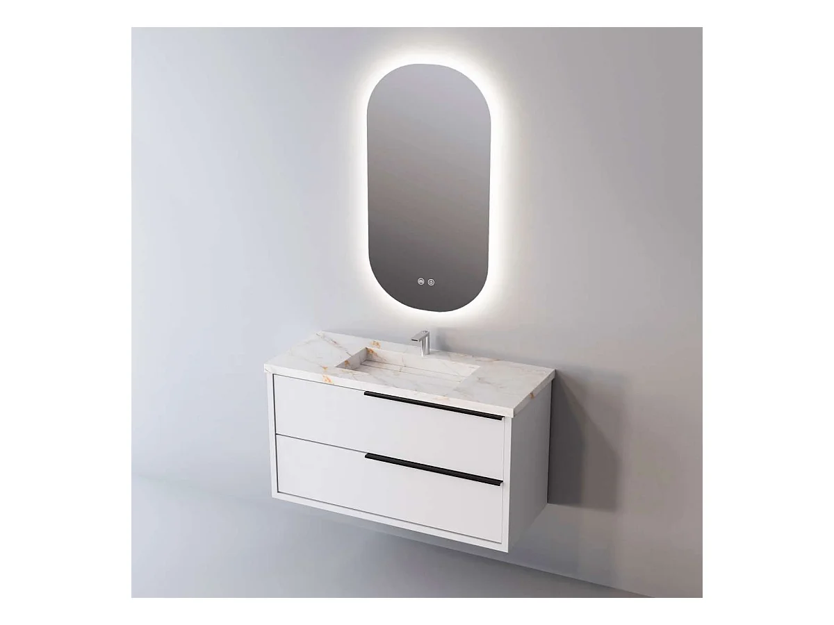 Meuble Salle de Bain LIKE (101 cm x H54 x P45 cm), Plan Vasque Grès Cérame BS, 2 Tiroirs Poignée Noir, Laqué Blanc Mat