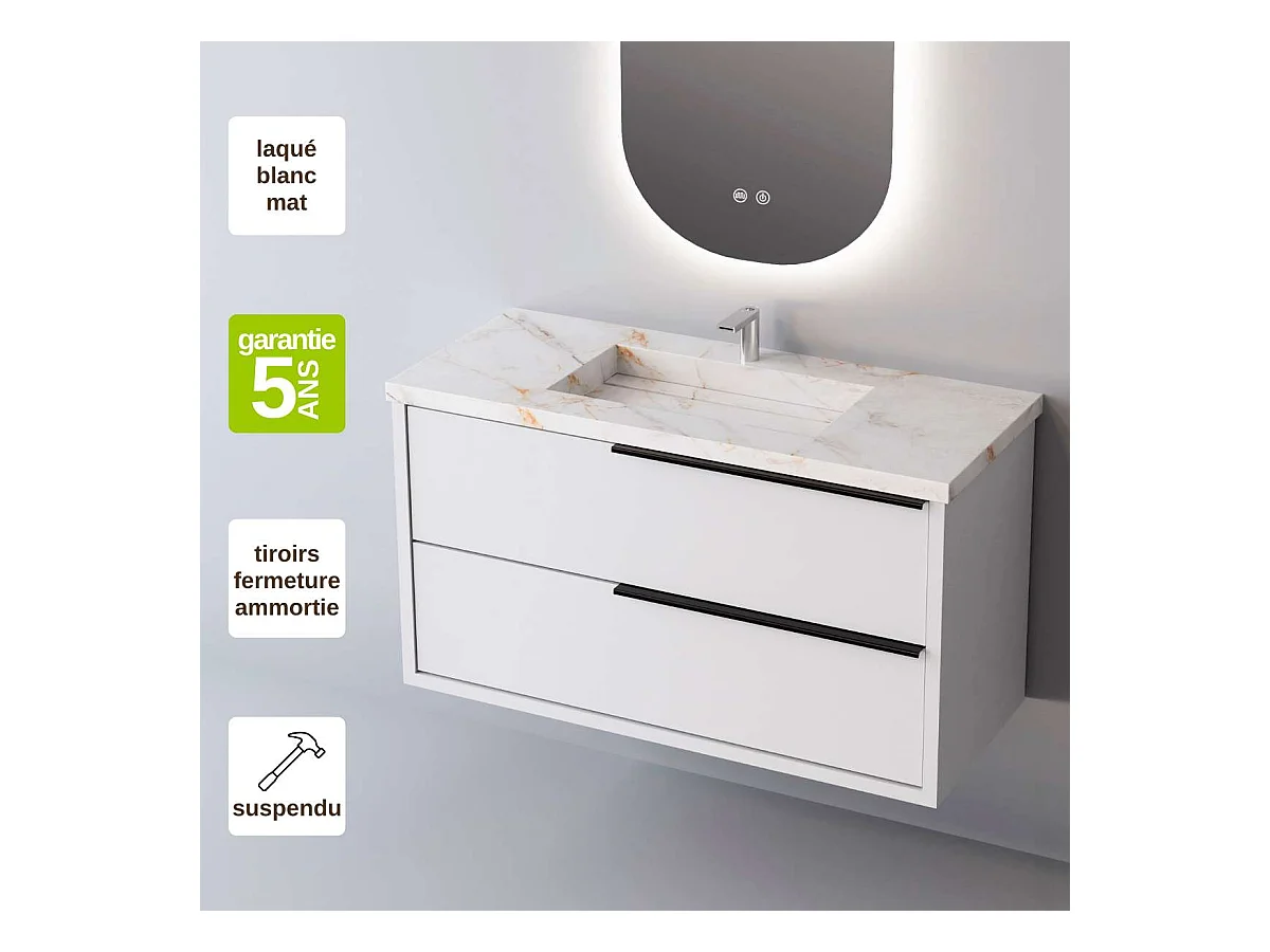 Meuble Salle de Bain LIKE (61 cm x H54 x P45 cm), Plan Vasque Grès Cérame BS, 2 Tiroirs Poignée Noir, Laqué Blanc Mat