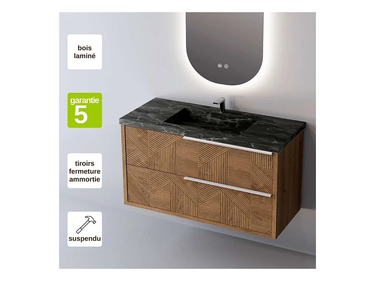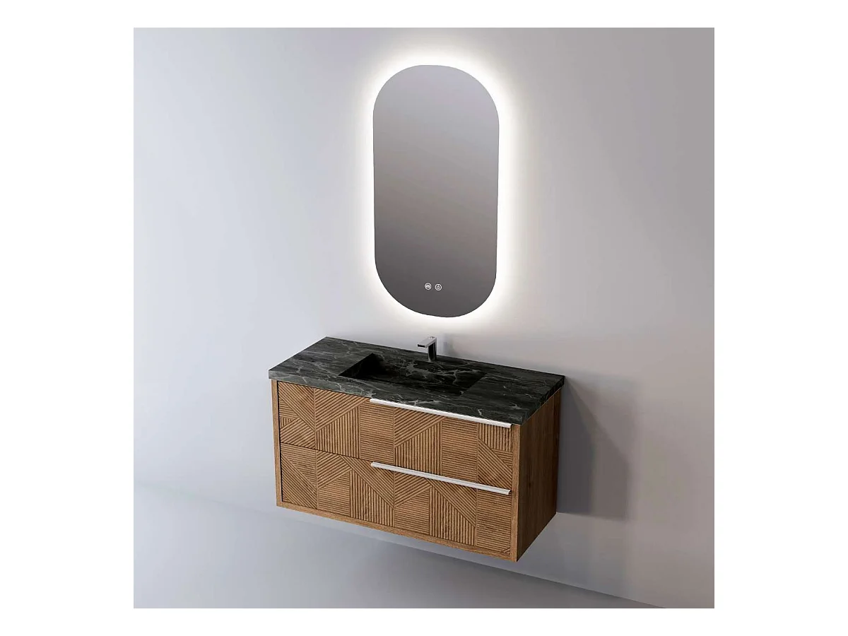Meuble Salle de Bain REEL (81 cm x H54 x P45 cm), Plan Vasque Grès Cérame NA, 2 Tiroirs Impression 3D Poignée Inox Satiné, Chêne Moyen