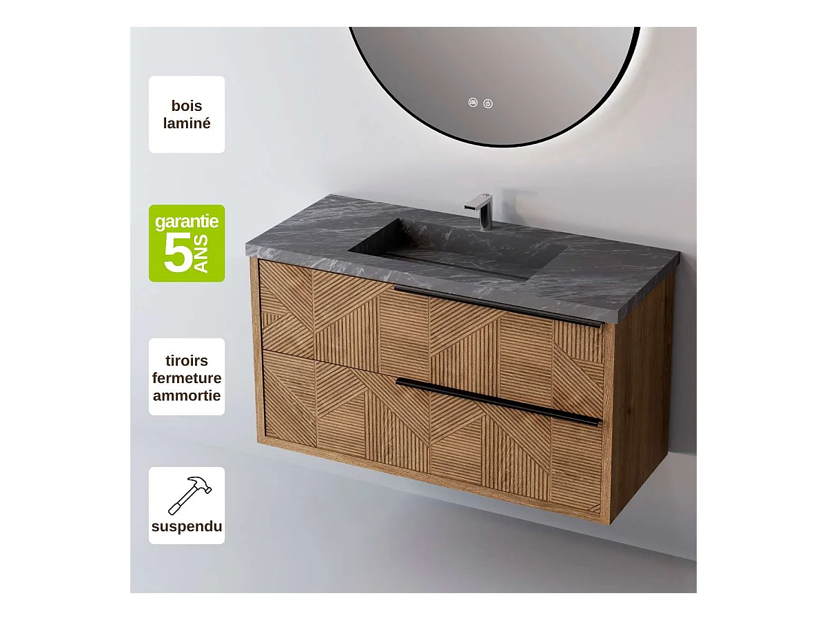 Meuble Salle de Bain REEL (61 cm x H54 x P45 cm), Plan Vasque Grès Cérame NA, 2 Tiroirs Impression 3D Poignée Noir, Chêne Moyen