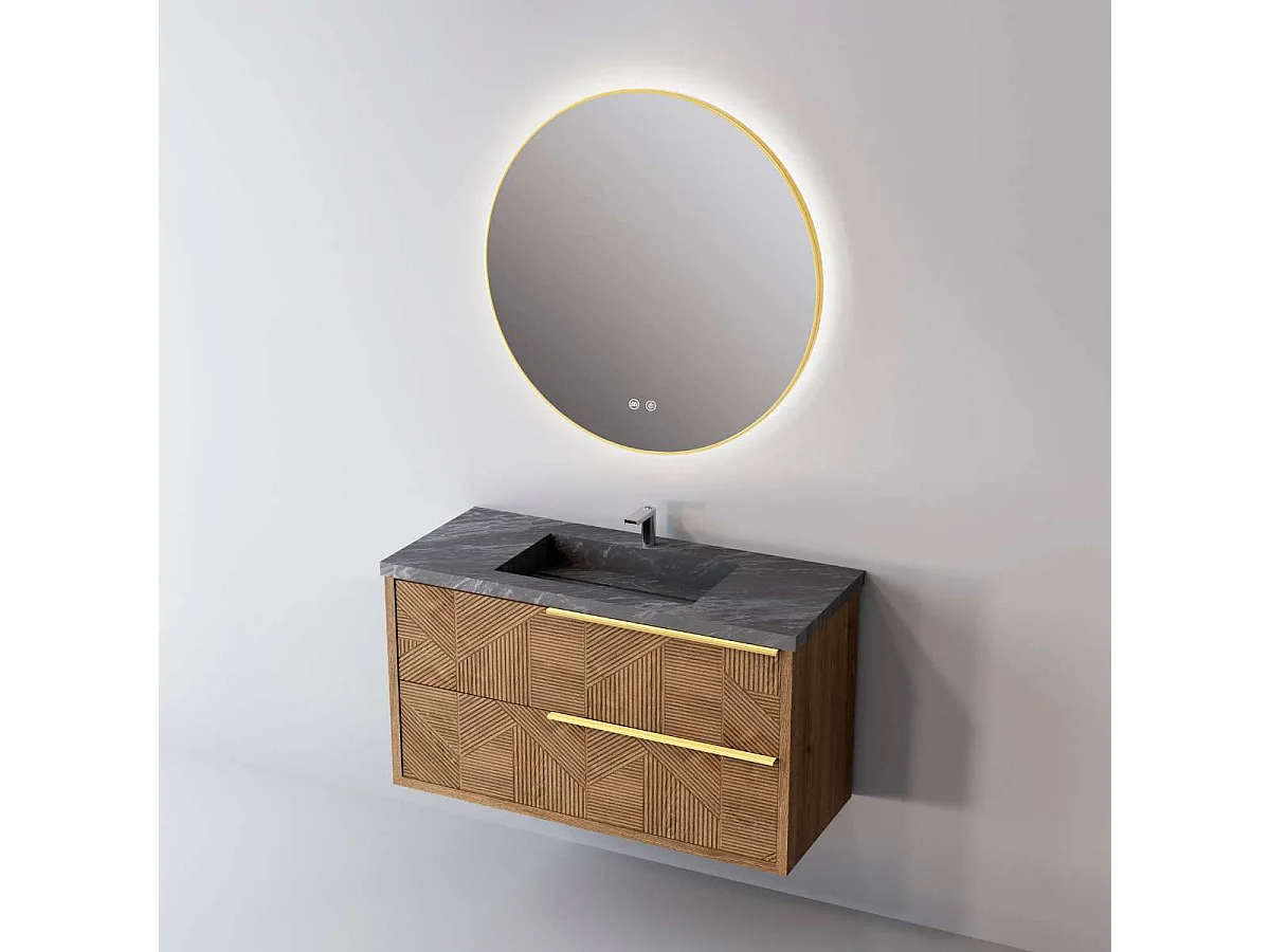 Meuble Salle de Bain REEL (81 cm x H54 x P45 cm), Plan Vasque Grès Cérame NA, 2 Tiroirs Impression 3D Poignée Or, Chêne Moyen