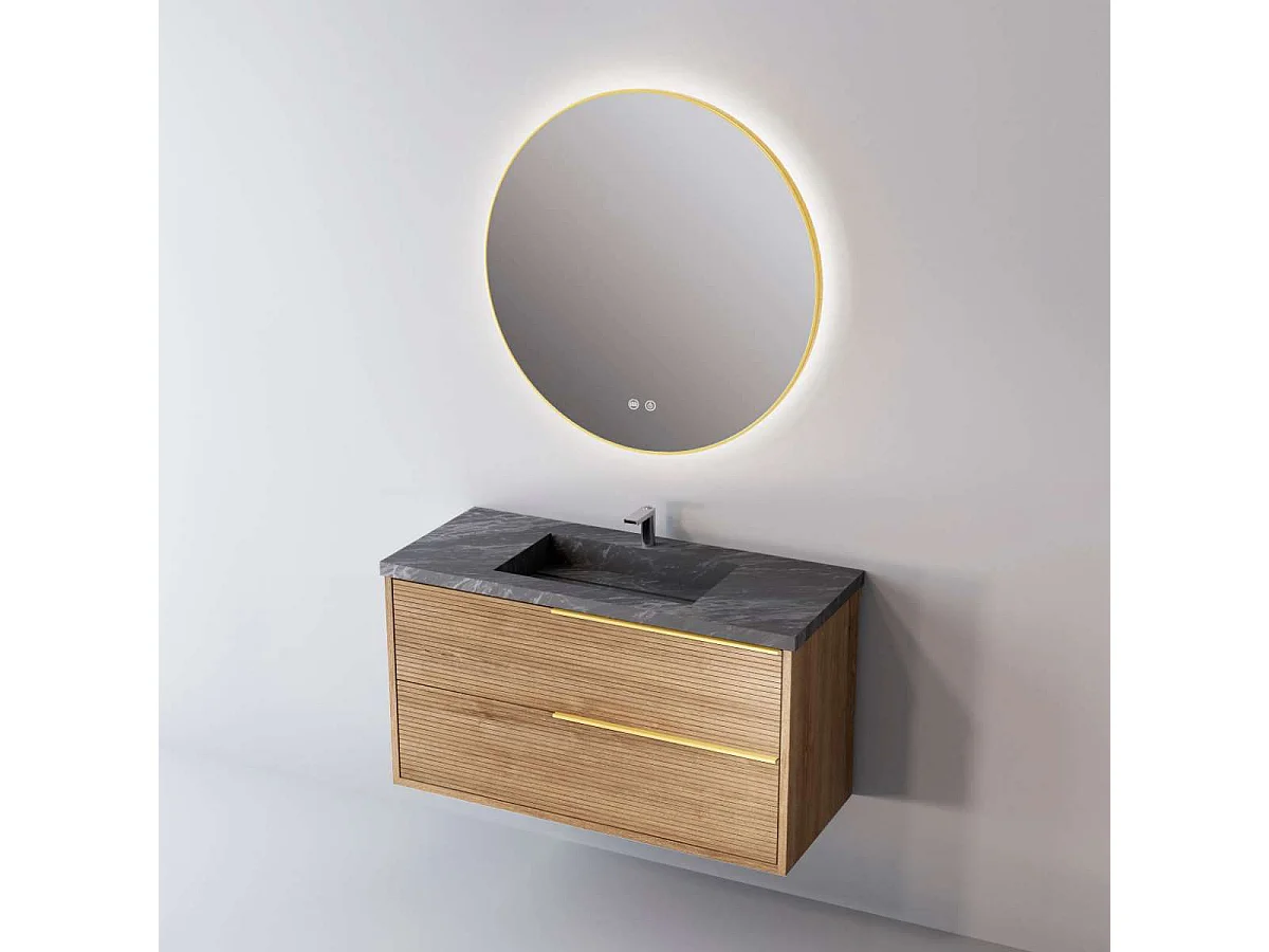 Meuble Salle de Bain LISTELLO (101 cm x H54 x P45 cm), Plan Vasque Grès Cérame NA, 2 Tiroirs Impression 3D Poignée Or, Chêne Naturel
