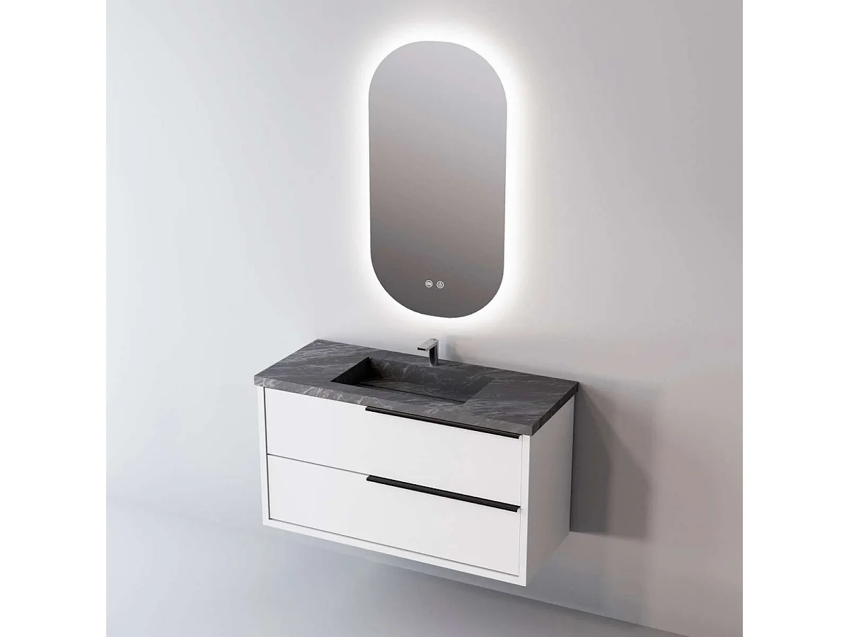 Meuble Salle de Bain LIKE (61 cm x H54 x P45 cm), Plan Vasque Grès Cérame NA, 2 Tiroirs Poignée Noir, Laqué Blanc Mat