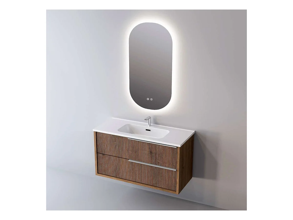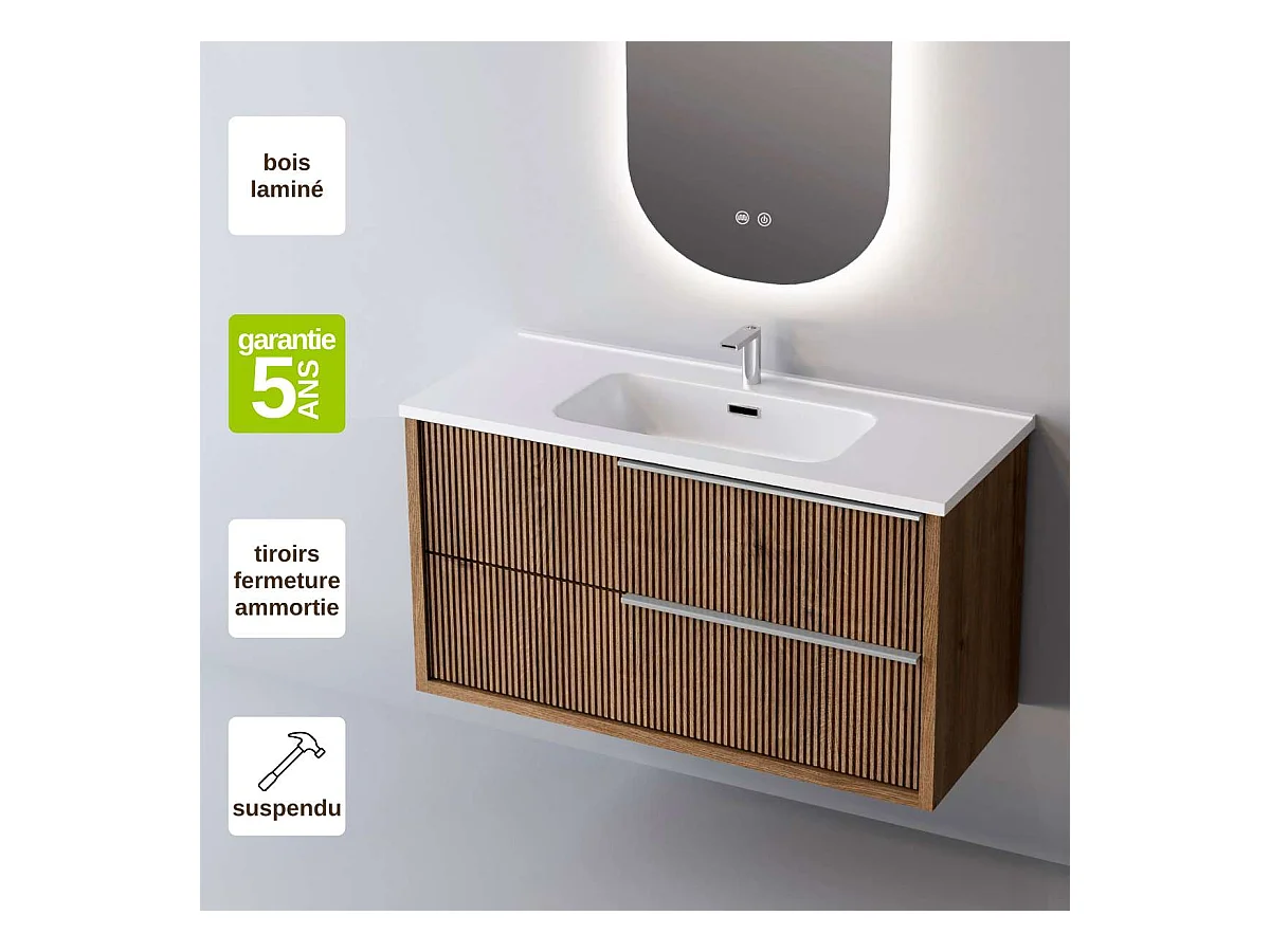 Meuble Salle de Bain TREND (101 cm x H54 x P45 cm), Plan Vasque Solide Surface, 2 Tiroirs Impression 3D Poignée Inox Satiné, Chêne Foncé
