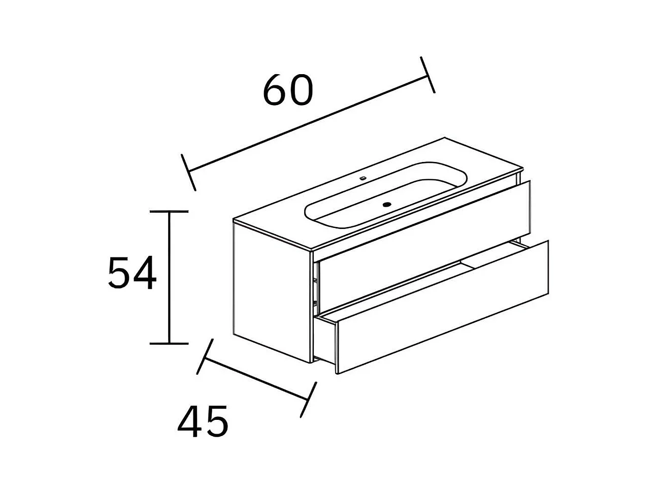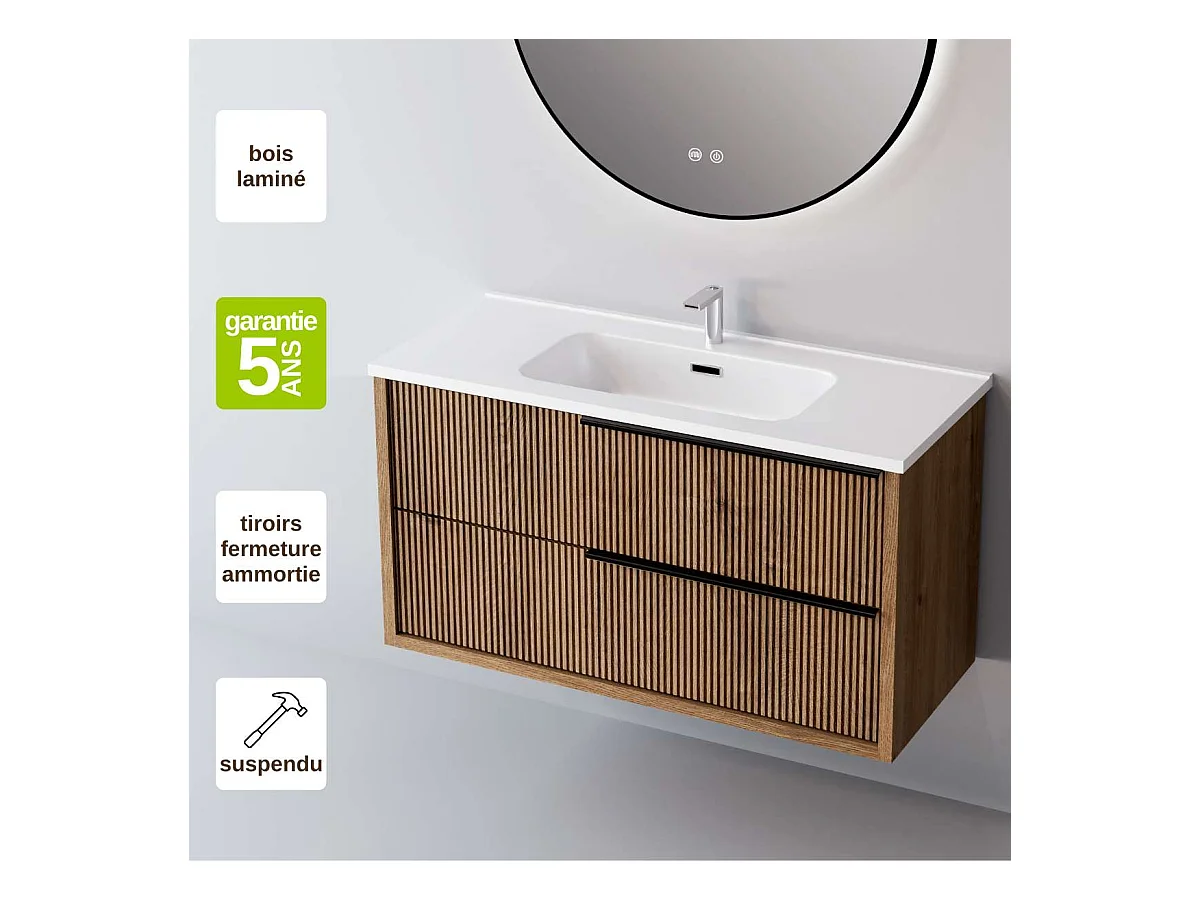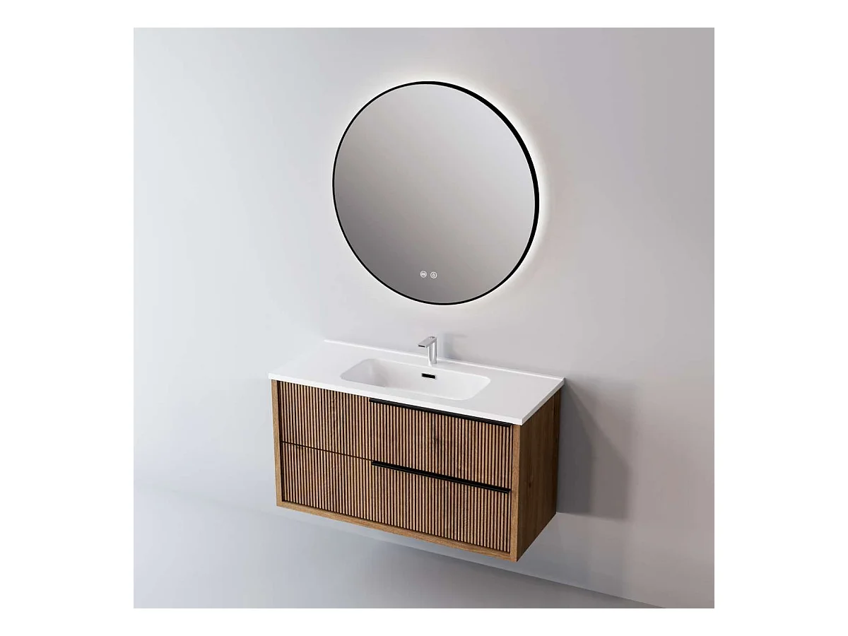 Meuble Salle de Bain TREND (61 cm x H54 x P45 cm), Plan Vasque Solide Surface, 2 Tiroirs Impression 3D Poignée Noir, Chêne Foncé