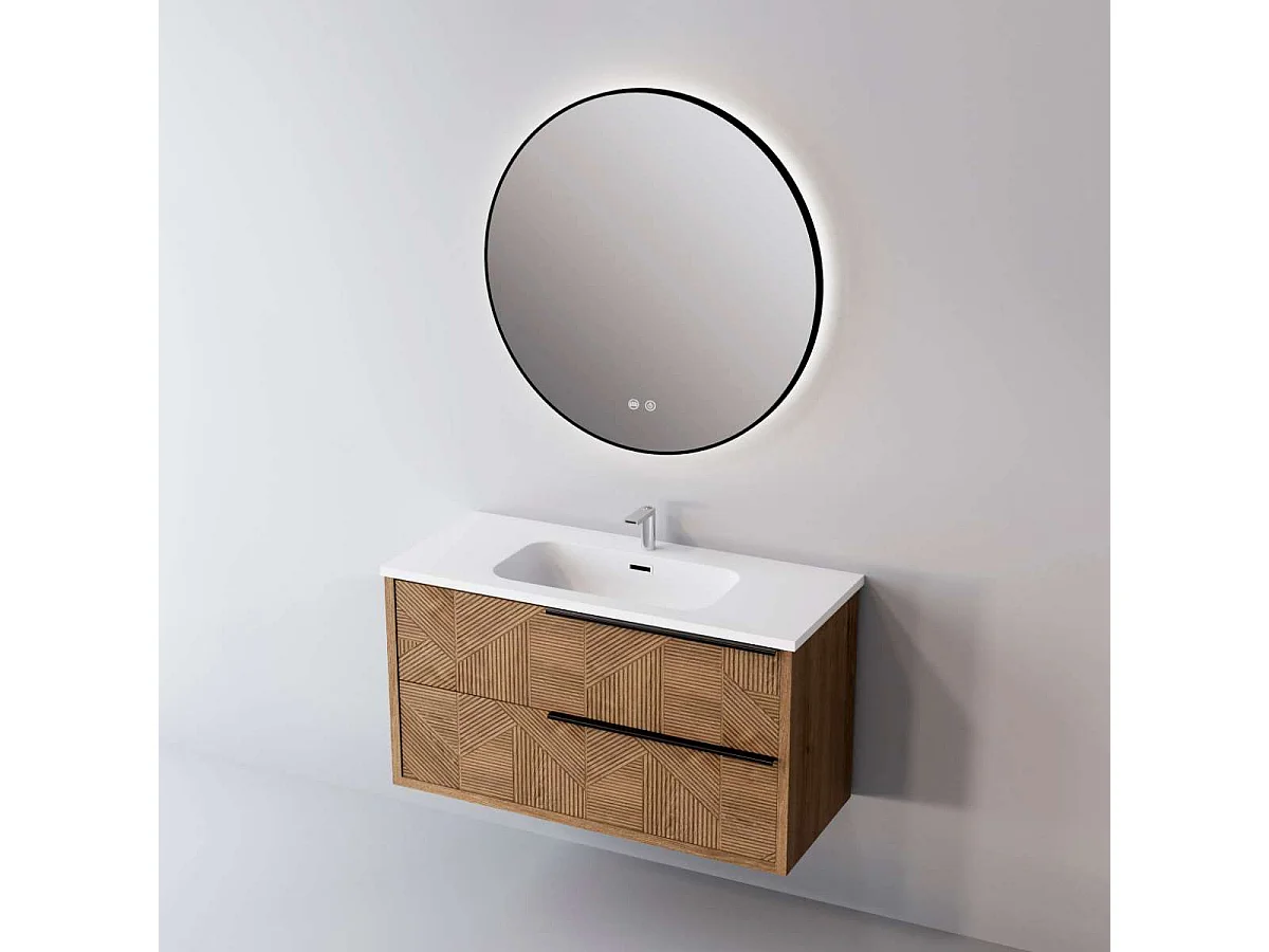 Meuble Salle de Bain REEL (61 cm x H54 x P45 cm), Plan Vasque Solide Surface, 2 Tiroirs Impression 3D Poignée Noir, Chêne Moyen
