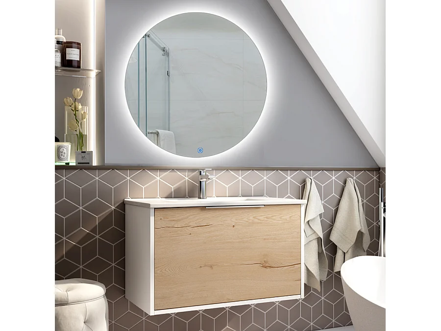 Meuble de salle de bain simple vasque - 1 façade et 2 tiroirs - ALBA et miroir rond SOLEN - blanc - 80cm