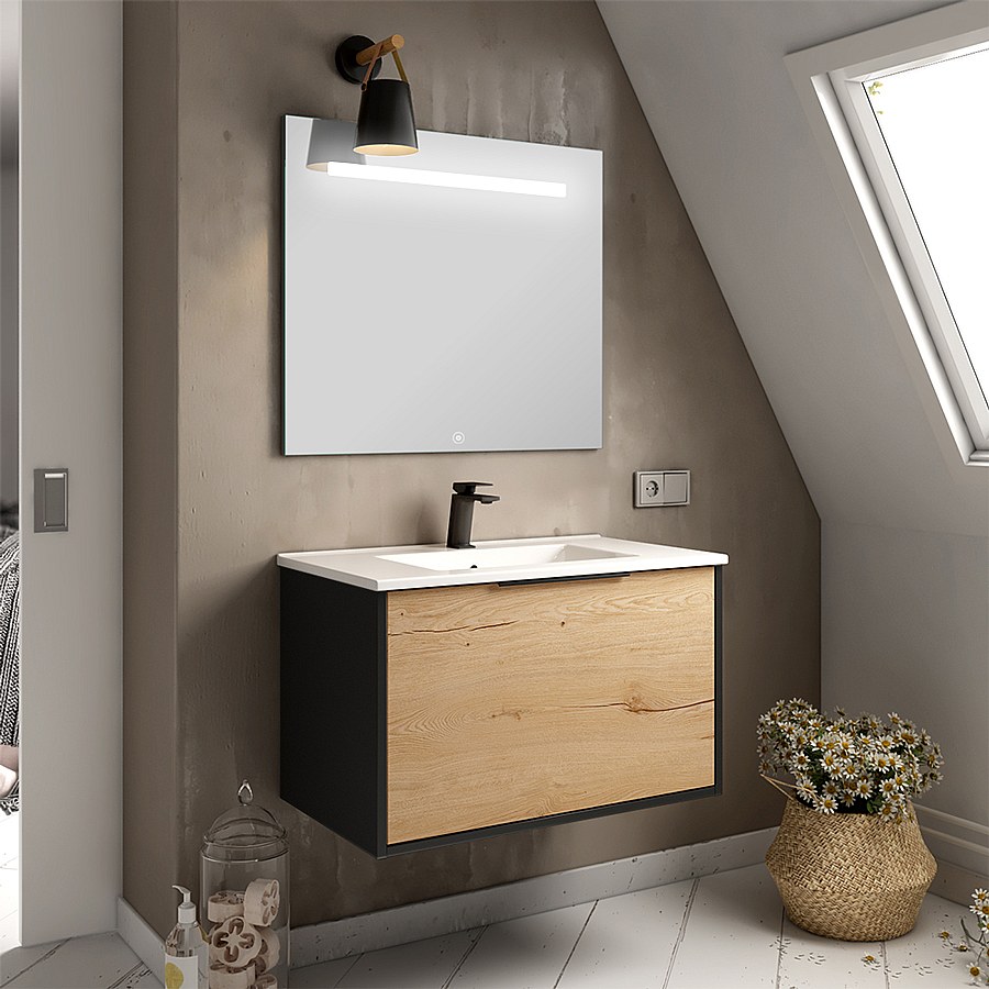 Meuble de salle de bain simple vasque - 1 façade et 2 tiroirs - ALBA et miroir STAM - noir-Chêne - 80cm