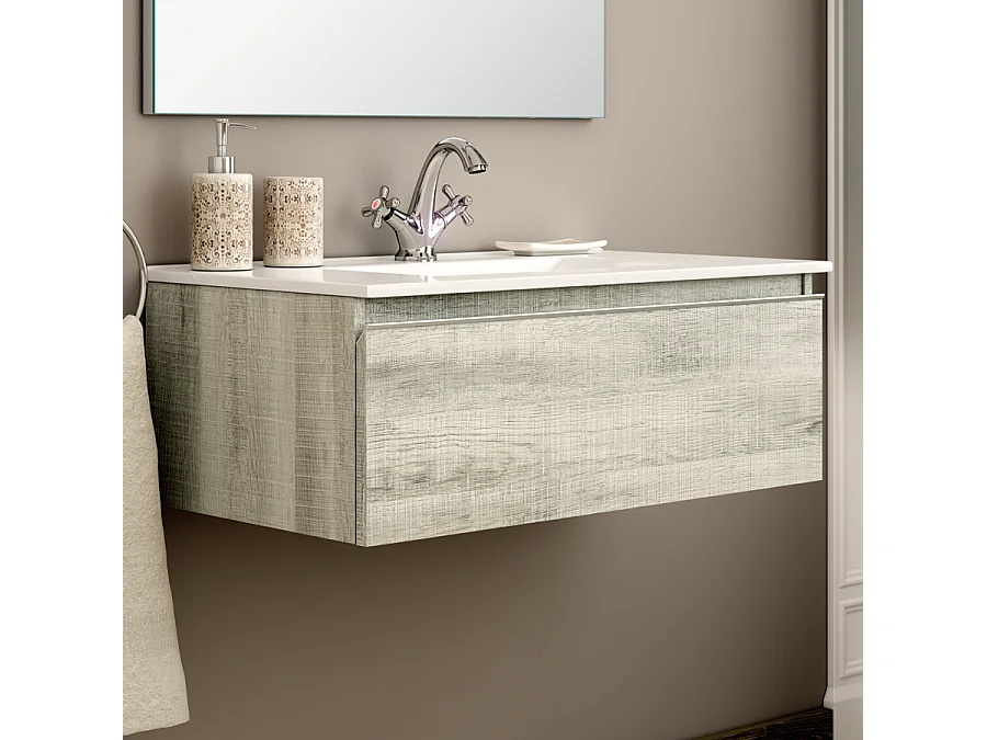 Meuble de salle de bain simple vasque - 1 tiroir - PENA et miroir rond Led SOLEN - Coral - 80cm