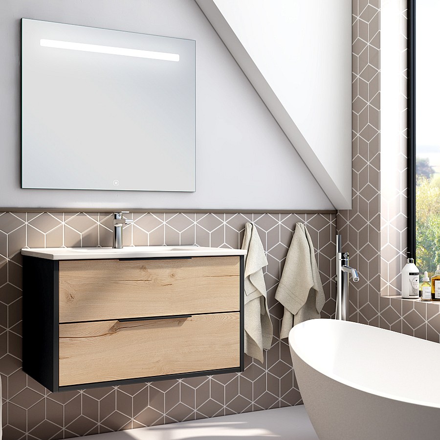 Meuble de salle de bain simple vasque - 2 tiroirs - ALBA et miroir STAM - noir-Chêne - 80cm