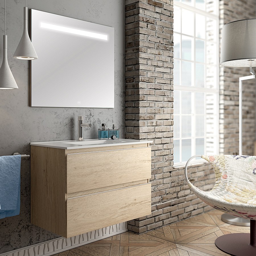 Meuble de salle de bain simple vasque - 2 tiroirs - BALEA et miroir Led STAM - bambou (chêne clair) - 80cm