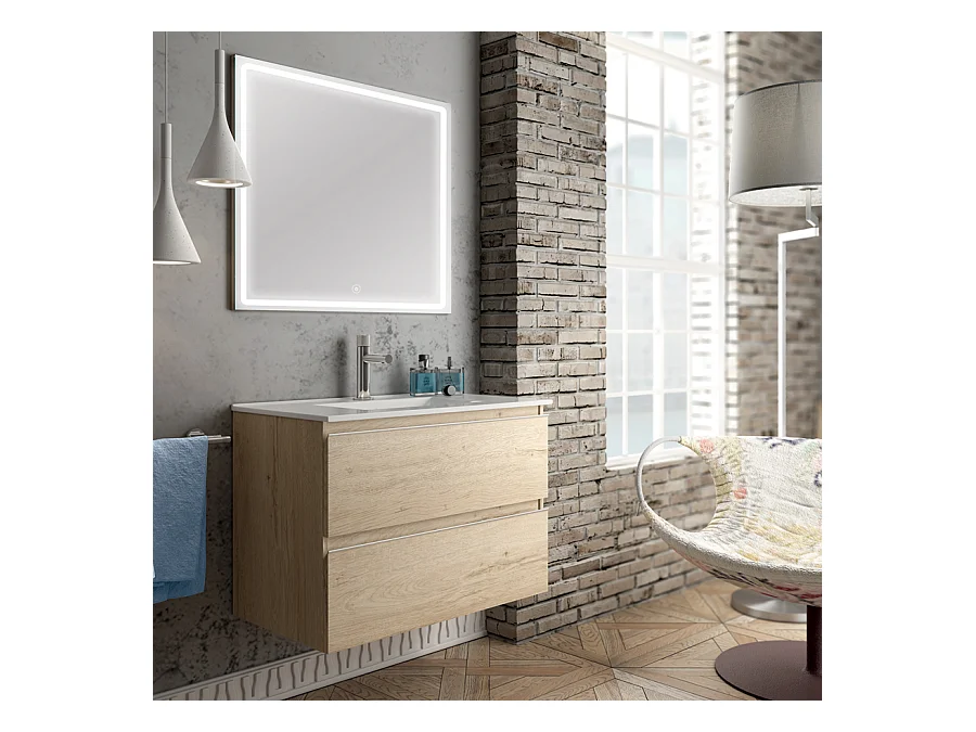 Meuble de salle de bain simple vasque - 2 tiroirs - BALEA et miroir Led VELDI - bambou (chêne clair) - 100cm