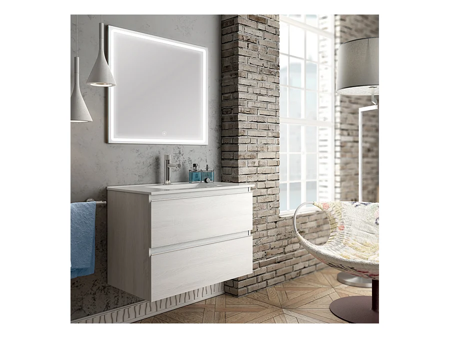 Meuble de salle de bain simple vasque - 2 tiroirs - BALEA et miroir Led VELDI - hibernian (bois blanchi) - 60cm