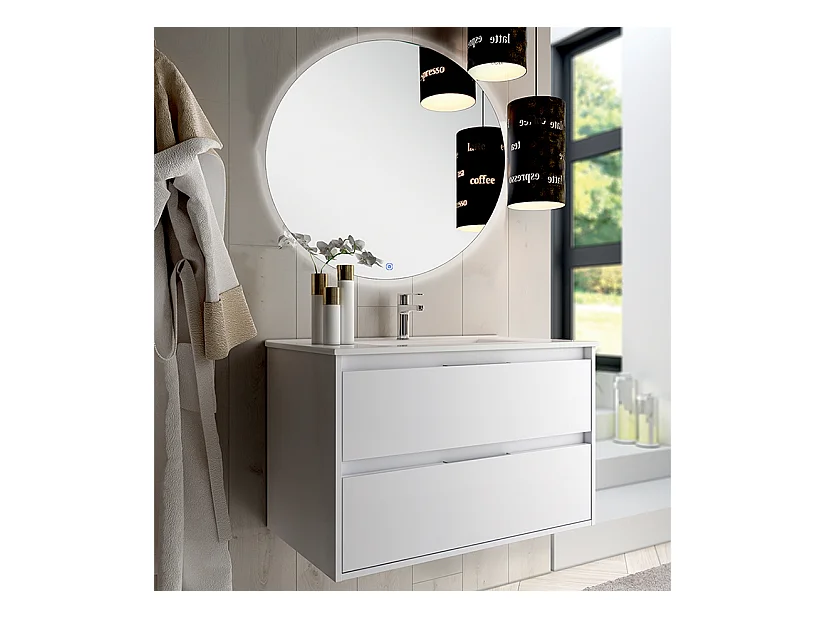 Meuble de salle de bain simple vasque - 2 tiroirs - IRIS et miroir rond Led SOLEN - blanc - 80cm