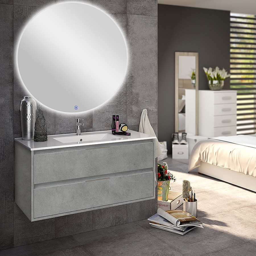 Meuble de salle de bain simple vasque - 2 tiroirs - IRIS et miroir rond Led SOLEN - ciment (gris) - 80cm