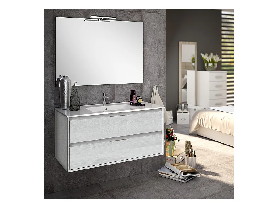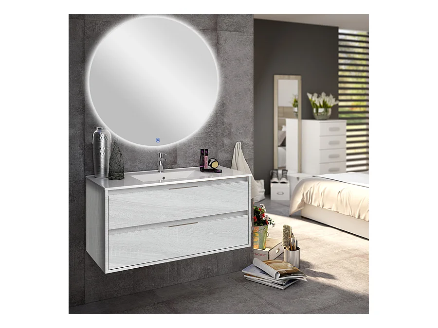 Meuble de salle de bain simple vasque - 2 tiroirs - IRIS et miroir rond Led SOLEN - hibernian (bois blanchi) - 80cm