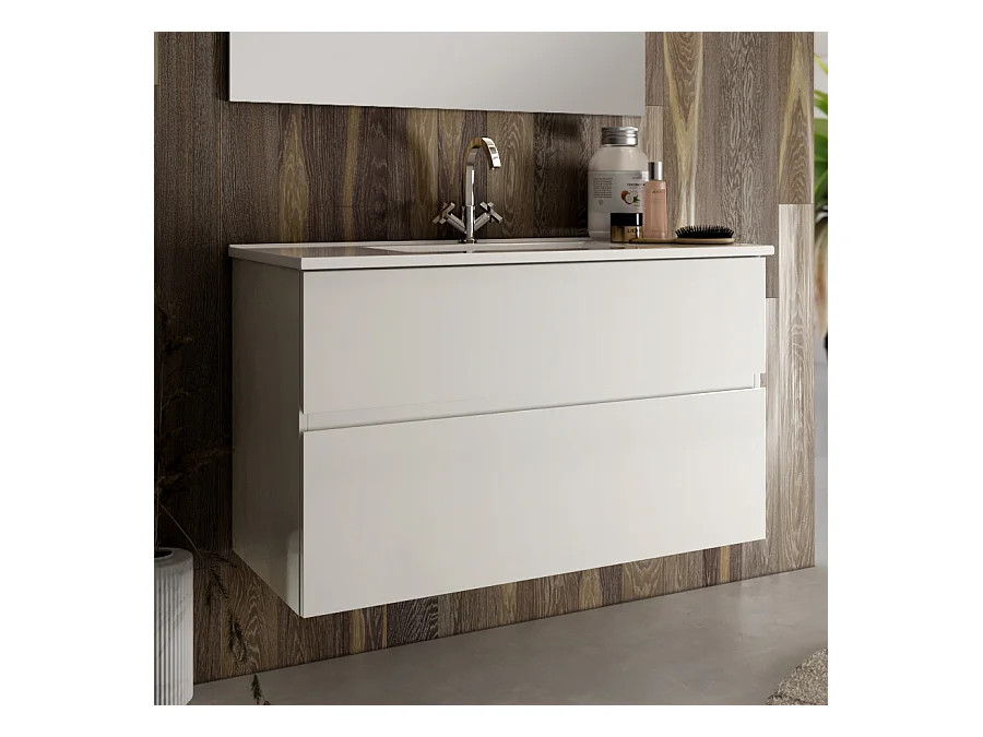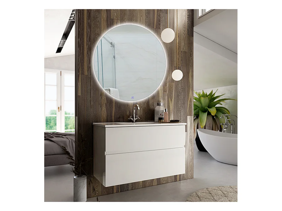 Meuble de salle de bain simple vasque - 2 tiroirs - MIG et miroir rond Led SOLEN - blanc - 60cm