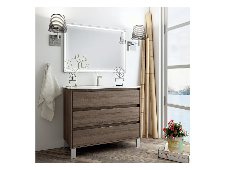 Meuble de salle de bain simple vasque - 3 tiroirs - TIRIS 3C et miroir Led STAM - britannia (chêne foncé) - 100cm