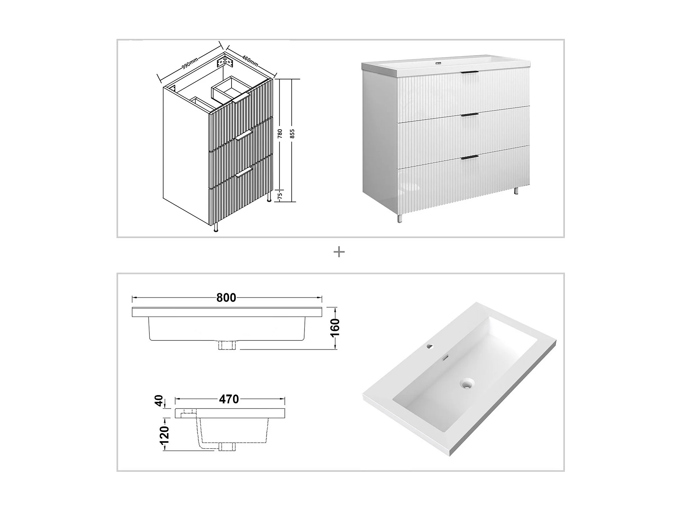 Meuble de salle de bain Strié Brillant, Meuble de sol 100cm avec simple lavabo + 3 tiroirs, Blanc
