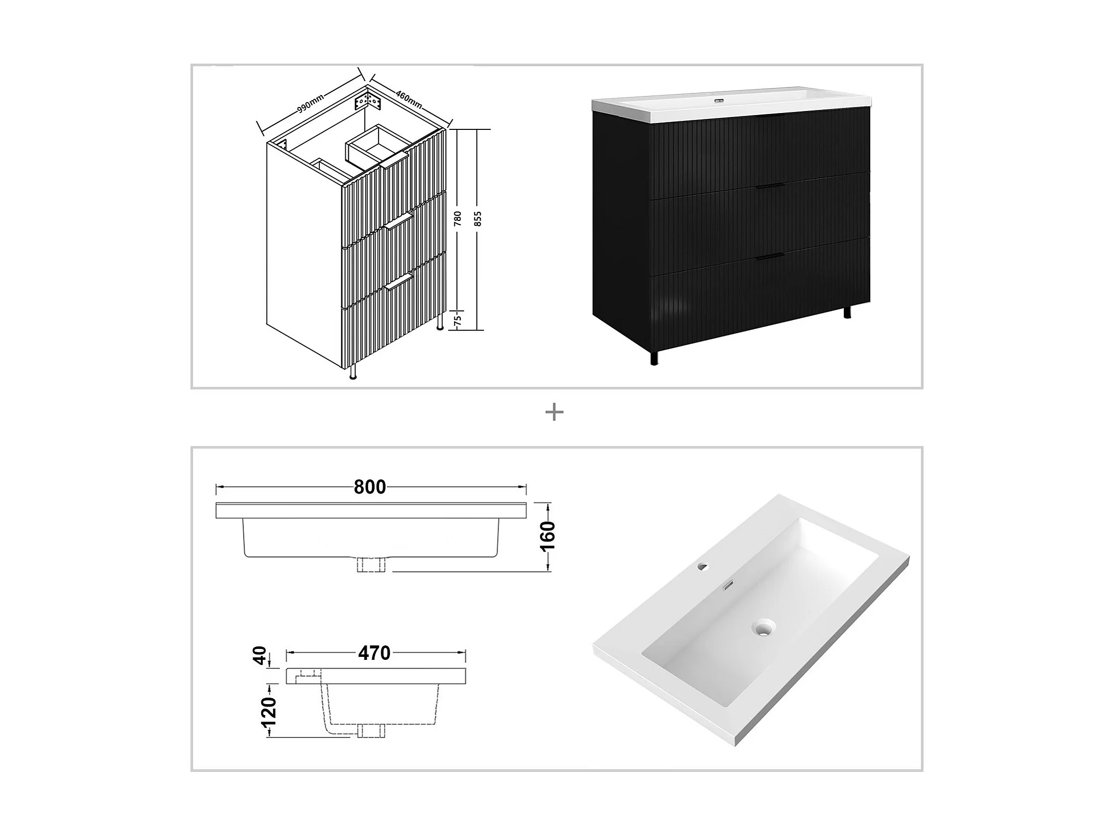 Meuble de salle de bain Strié Brillant, Meuble de sol 100cm avec simple lavabo + 3 tiroirs, Noir