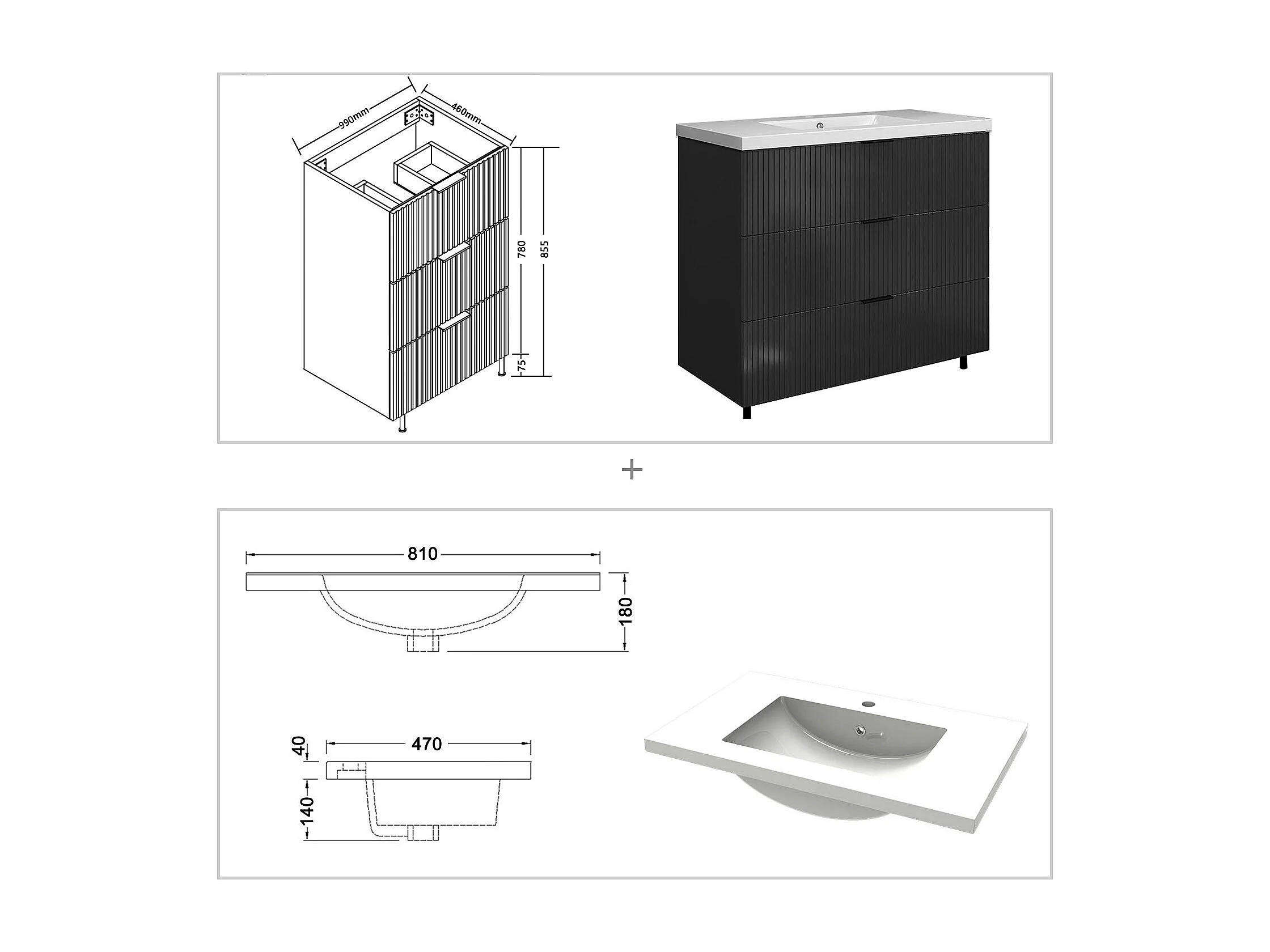 Meuble de salle de bain Strié Brillant, Meuble de sol 100cm avec simple vasque + 3 tiroirs, Anthracite