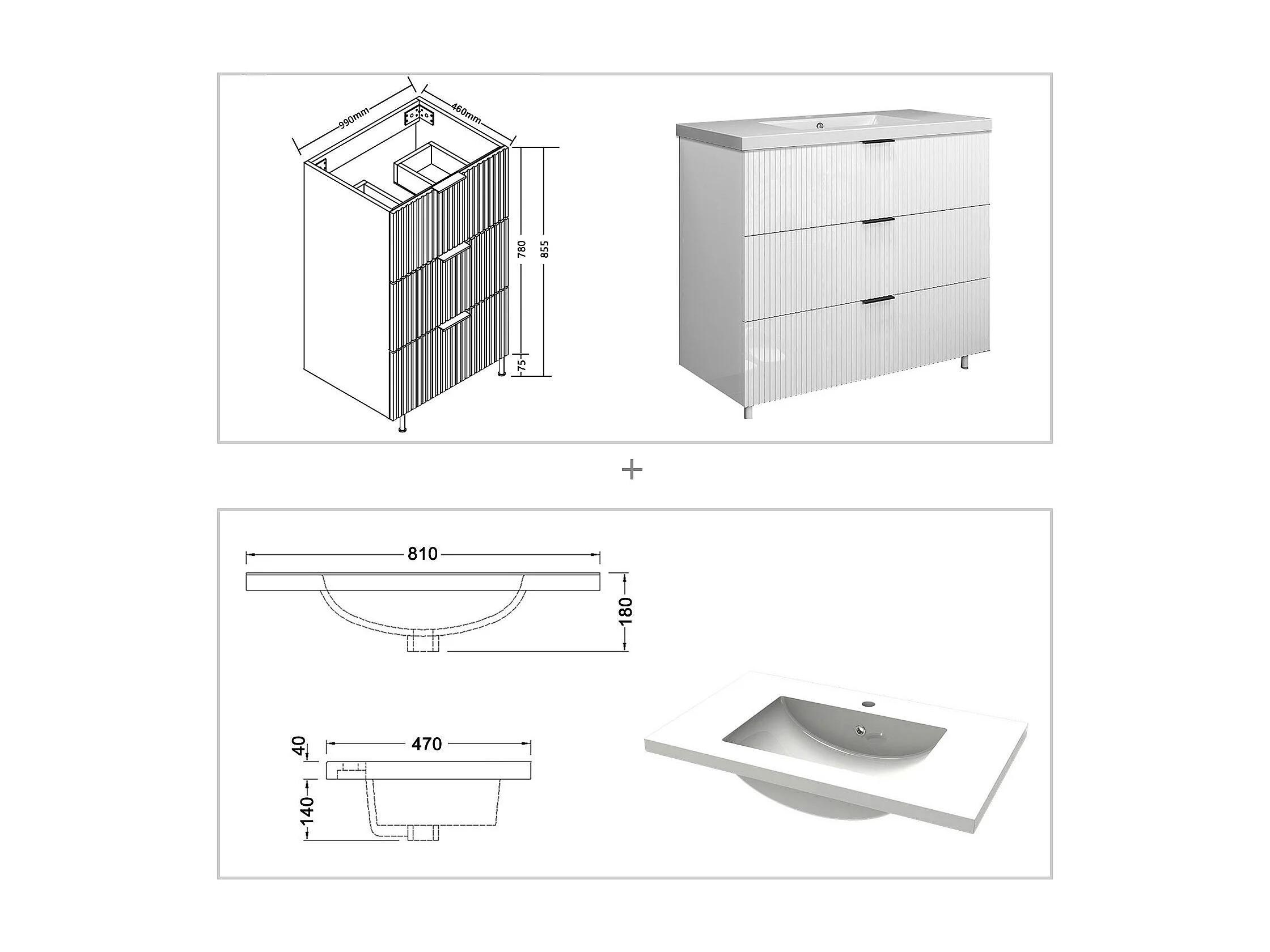 Meuble de salle de bain Strié Brillant, Meuble de sol 100cm avec simple vasque + 3 tiroirs, Blanc
