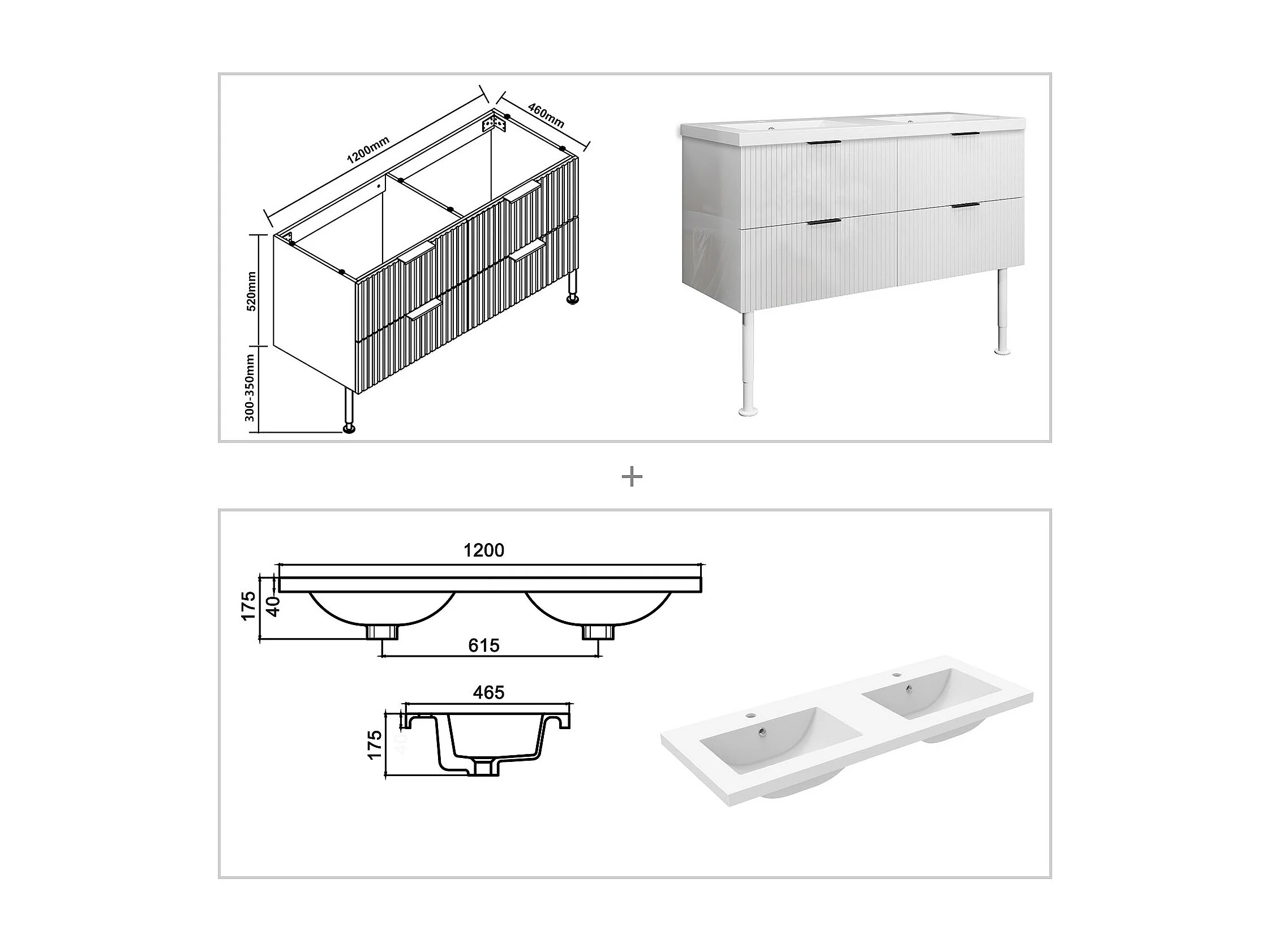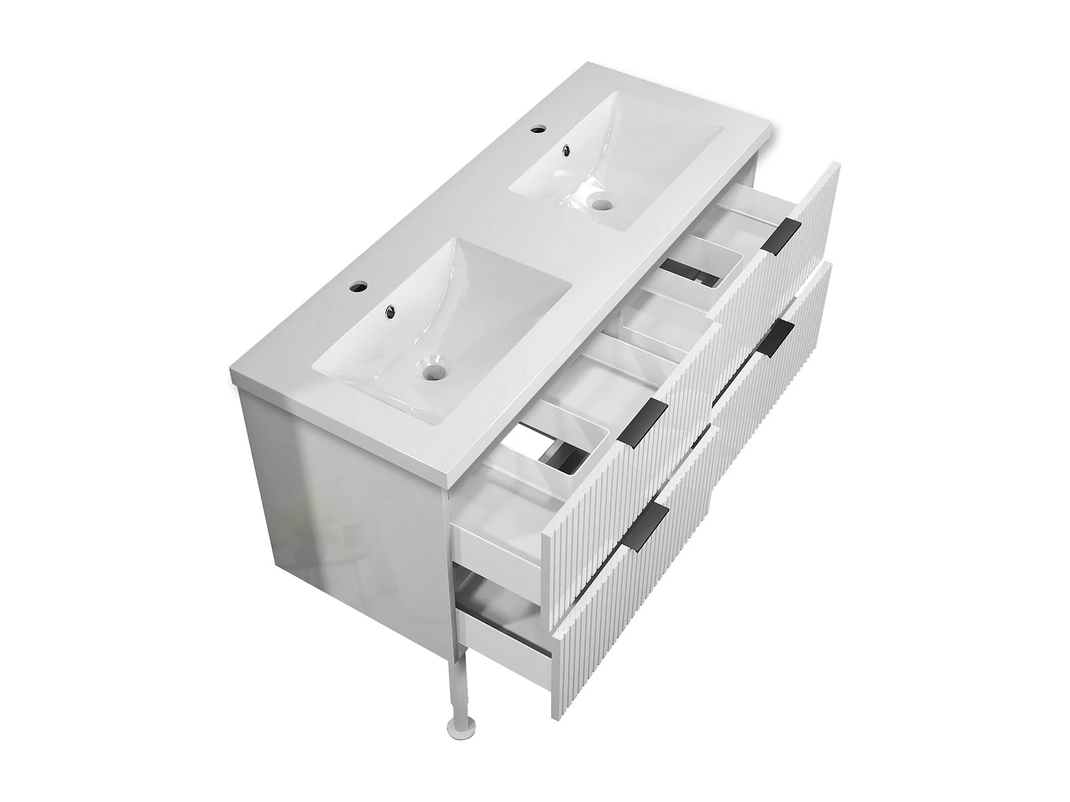 Meuble de salle de bain Strié Brillant, Meuble de sol 120cm avec simple vasque + 4 tiroirs, Blanc