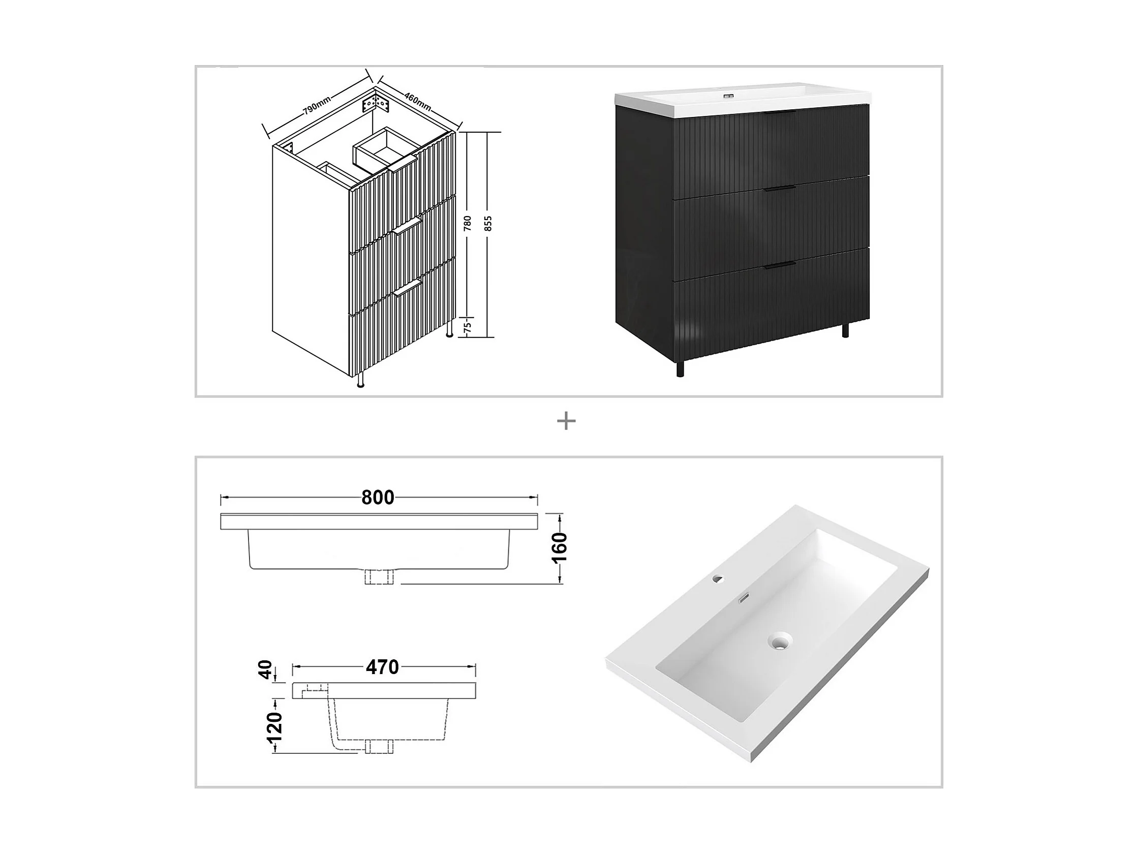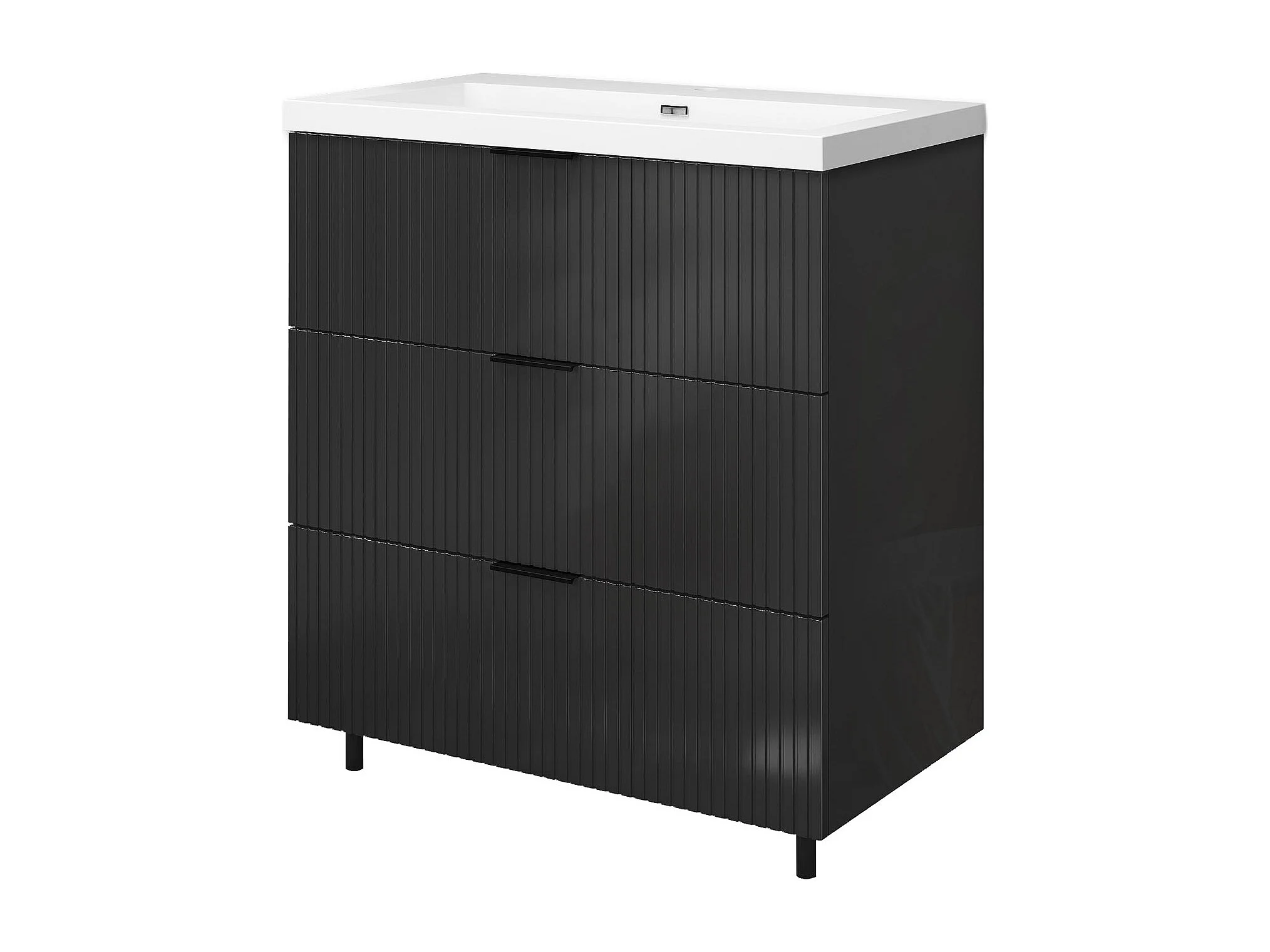 Meuble de salle de bain Strié Brillant, Meuble de sol 80cm avec simple lavabo + 3 tiroirs, Anthracite