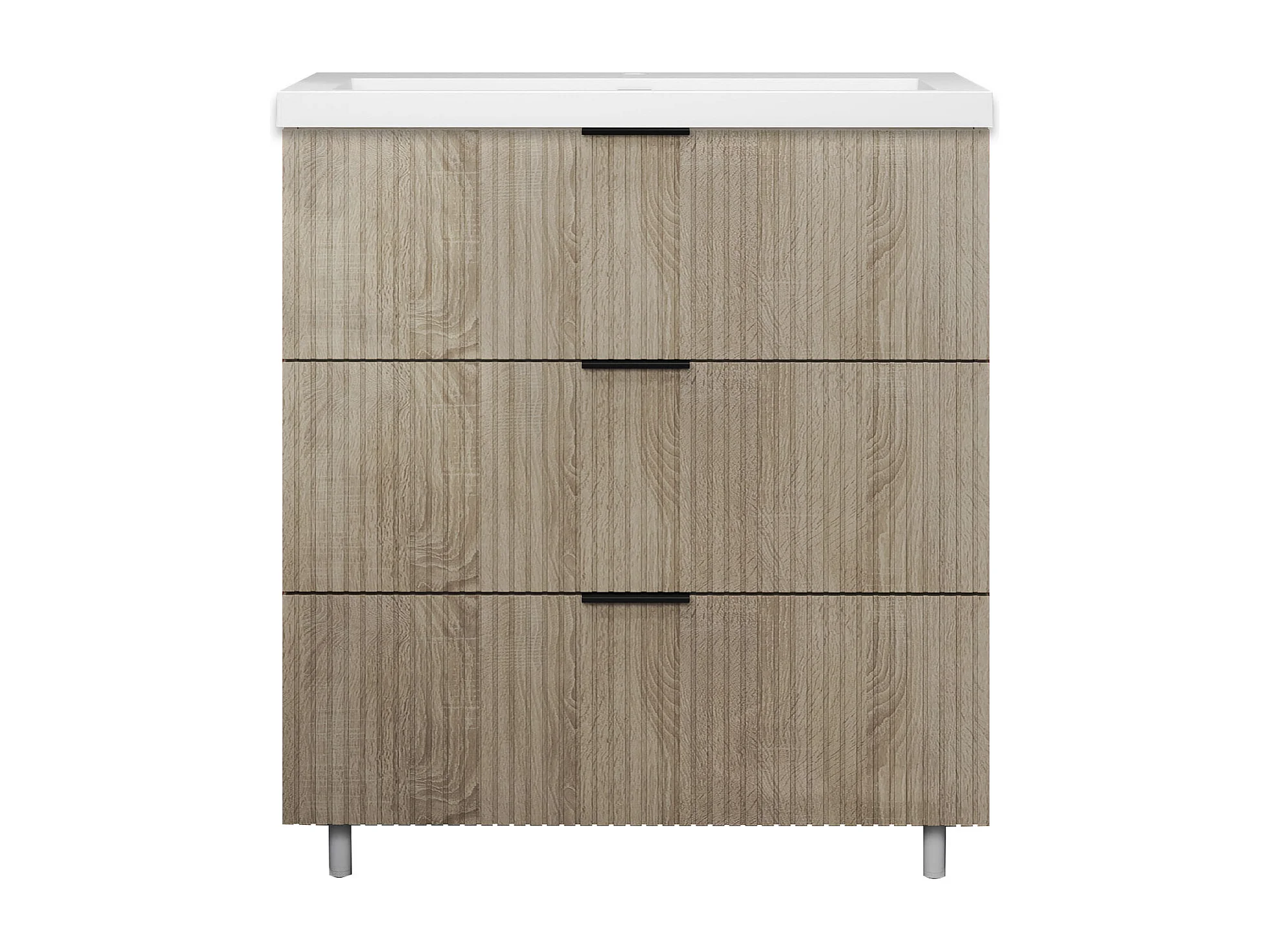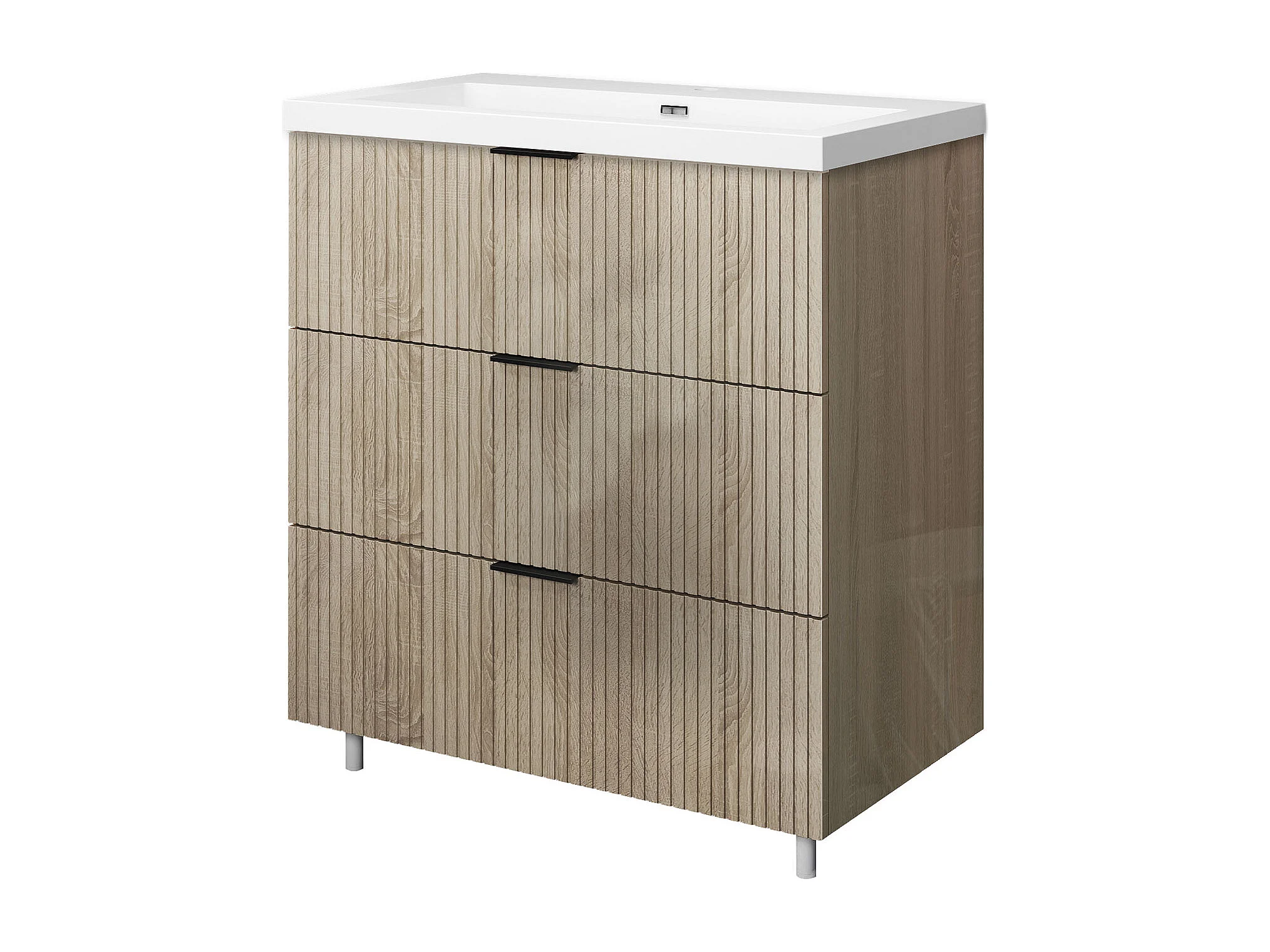 Meuble de salle de bain Strié Brillant, Meuble de sol 80cm avec simple lavabo + 3 tiroirs, Chêne