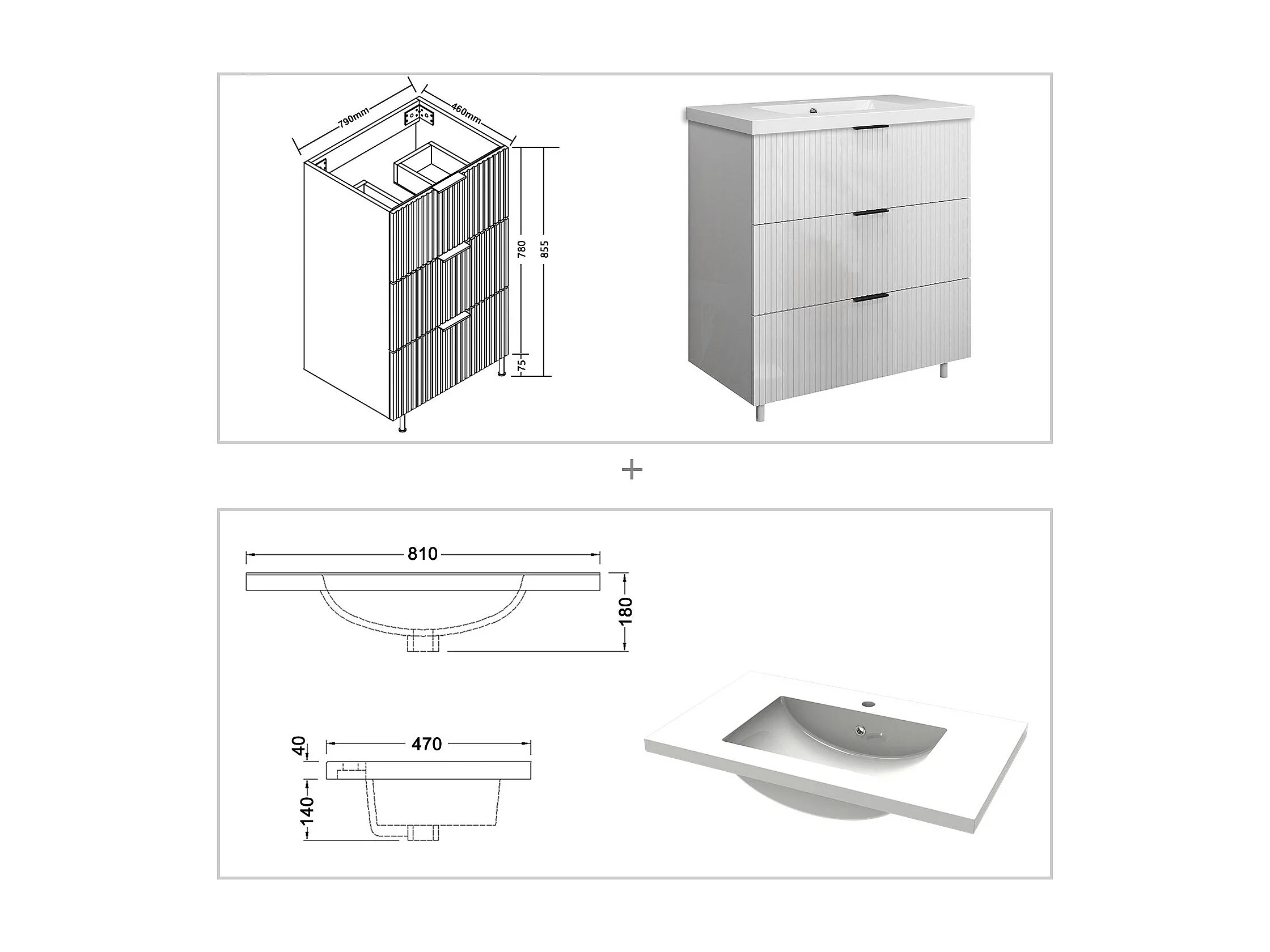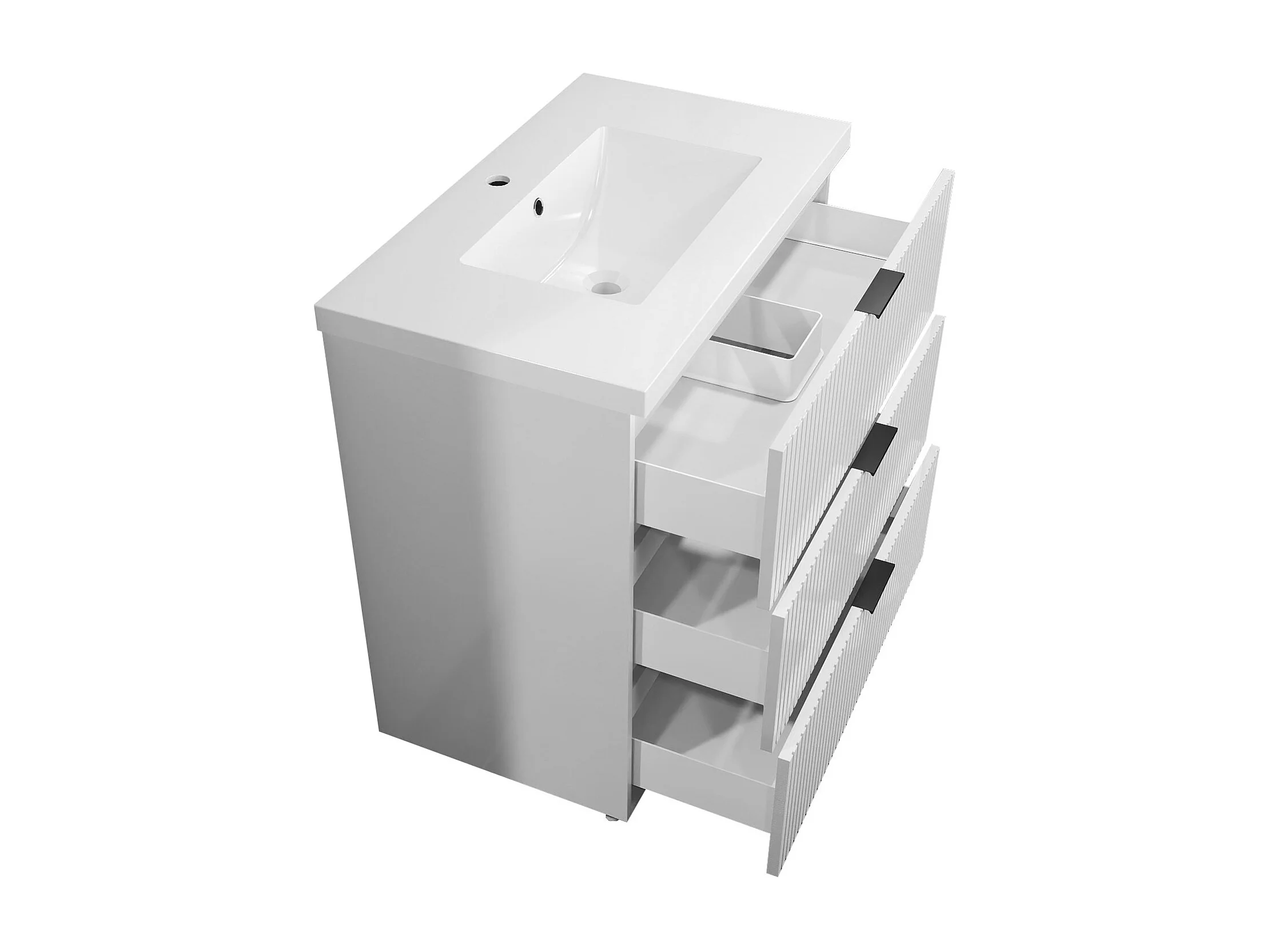Meuble de salle de bain Strié Brillant, Meuble de sol 80cm avec simple vasque + 3 tiroirs, Blanc