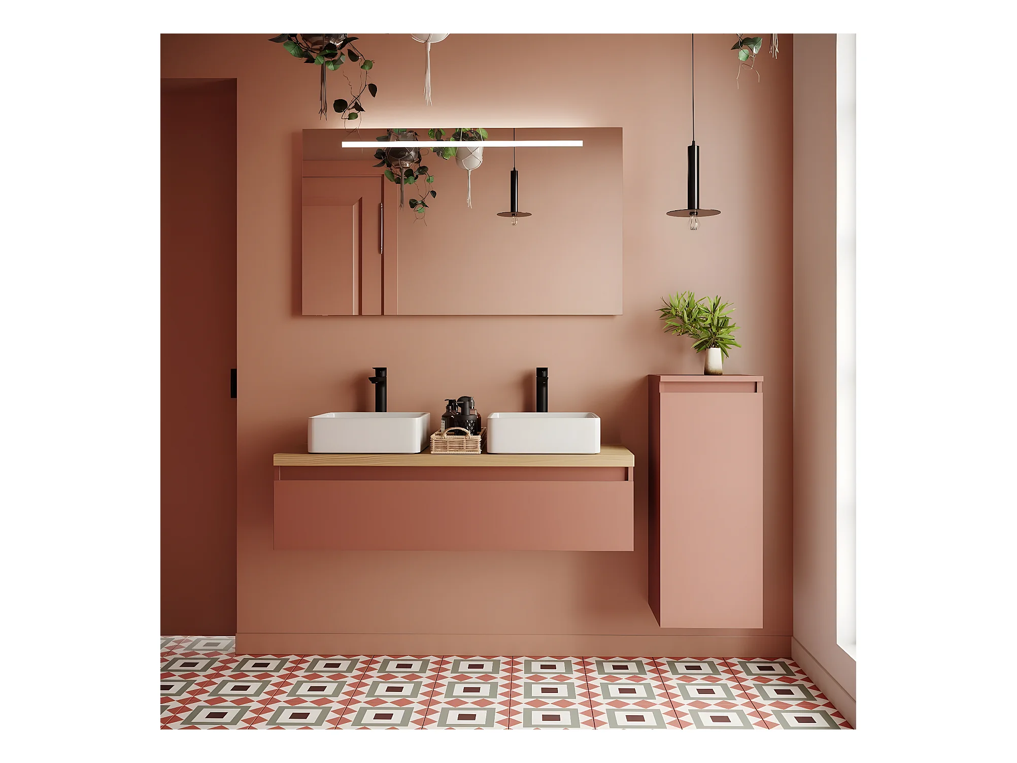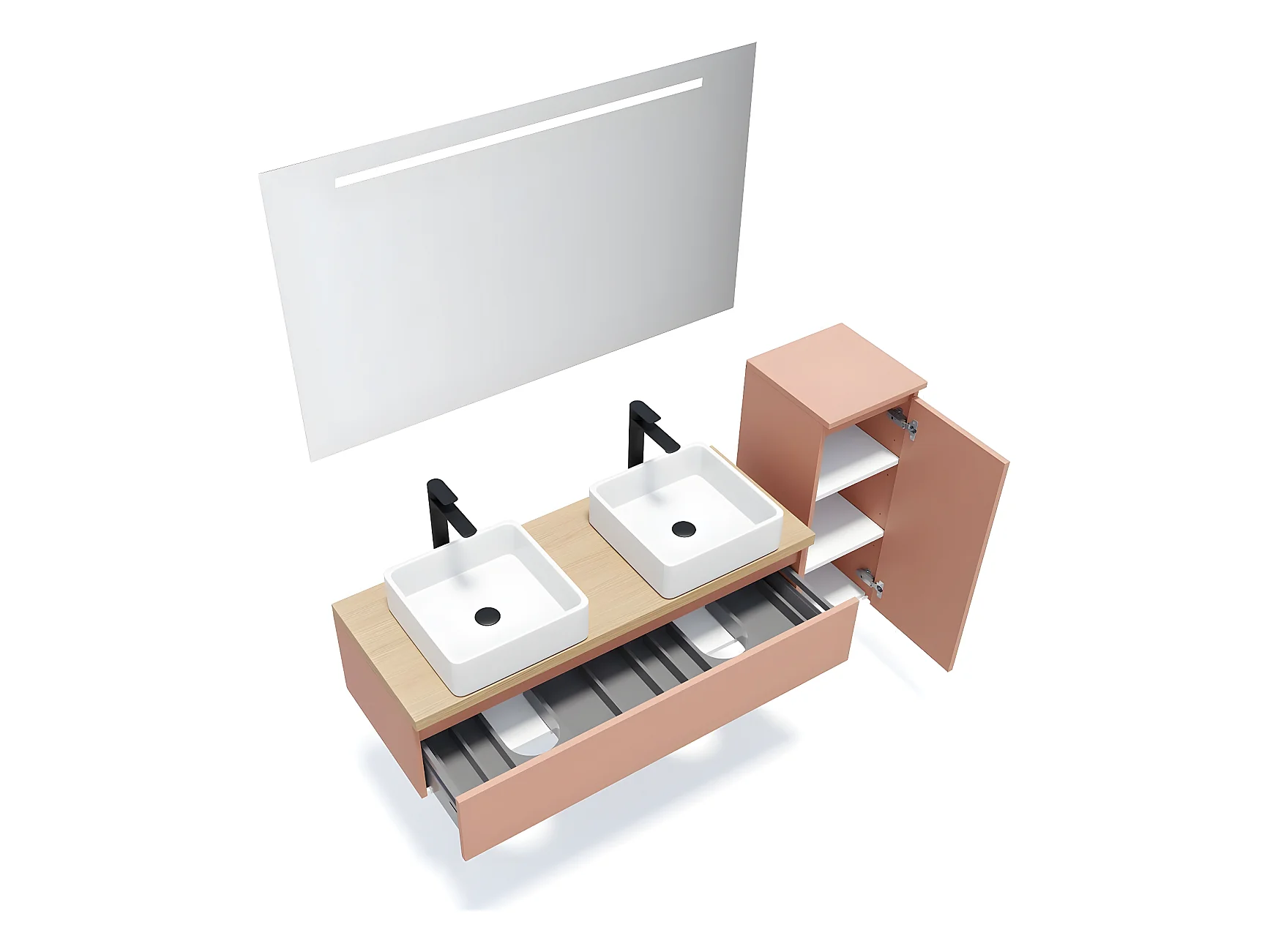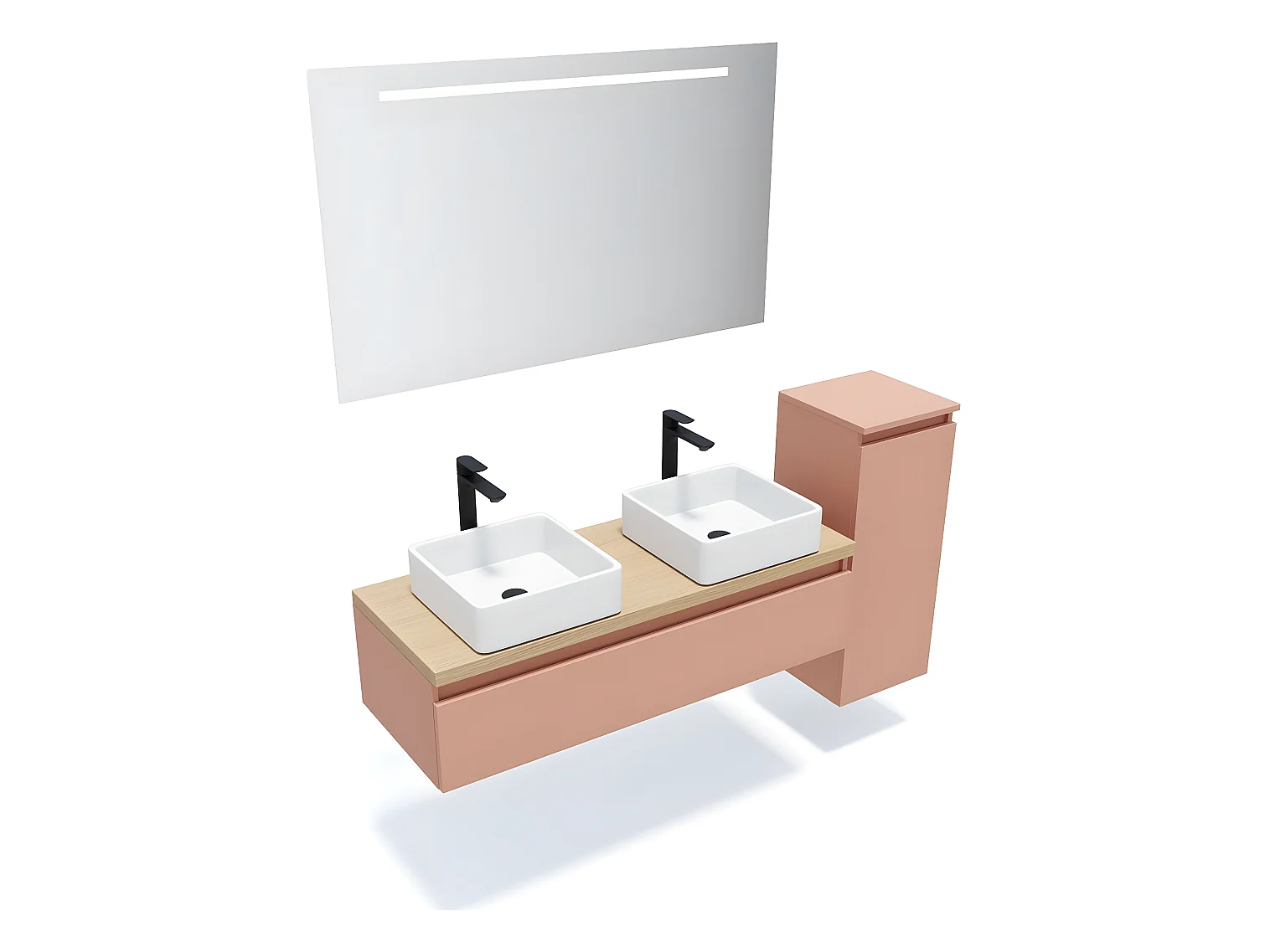 Meuble de salle de bain suspendu 2 vasques à poser 120cm 1 tiroir Abricot + miroir + colonne ouverture droite - Hudson