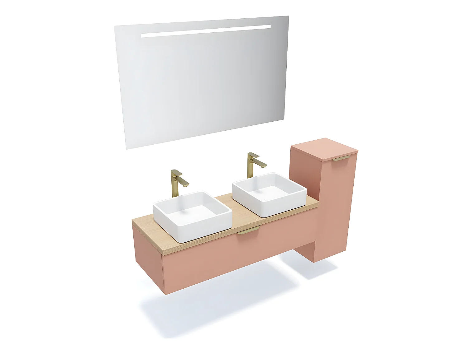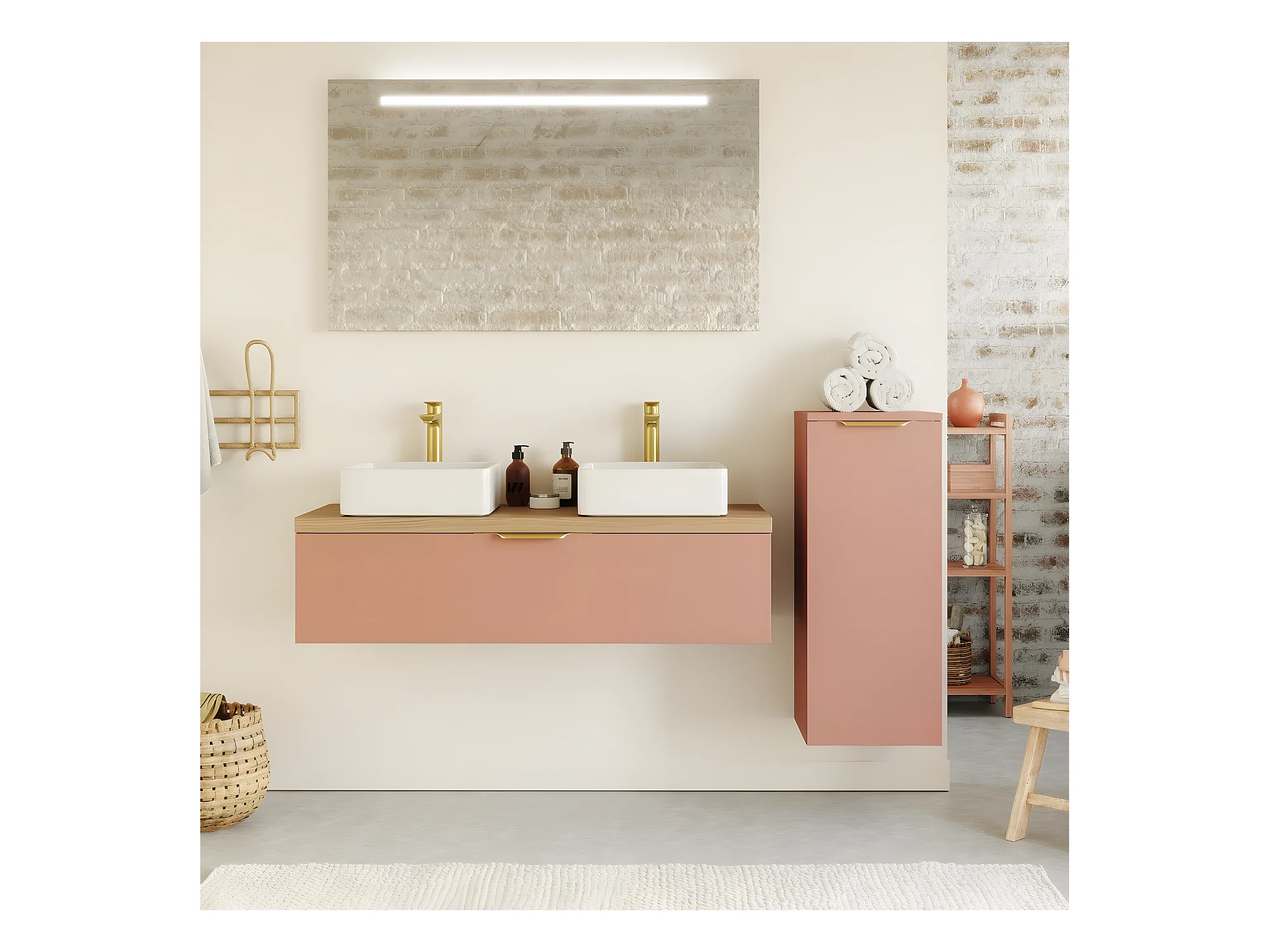 Meuble de salle de bain suspendu 2 vasques à poser 120cm 1 tiroir Abricot + miroir + colonne ouverture droite - Venice