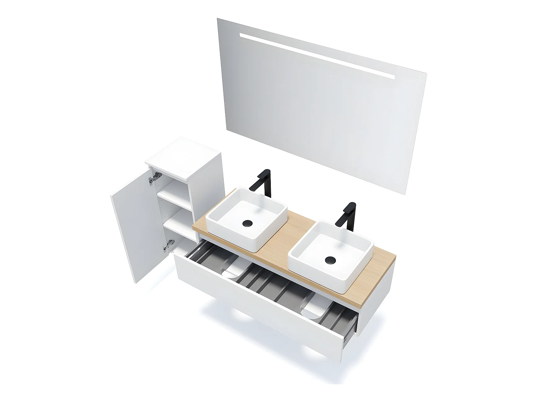 Meuble de salle de bain suspendu 2 vasques à poser 120cm 1 tiroir Blanc + miroir + colonne ouverture gauche - Hudson