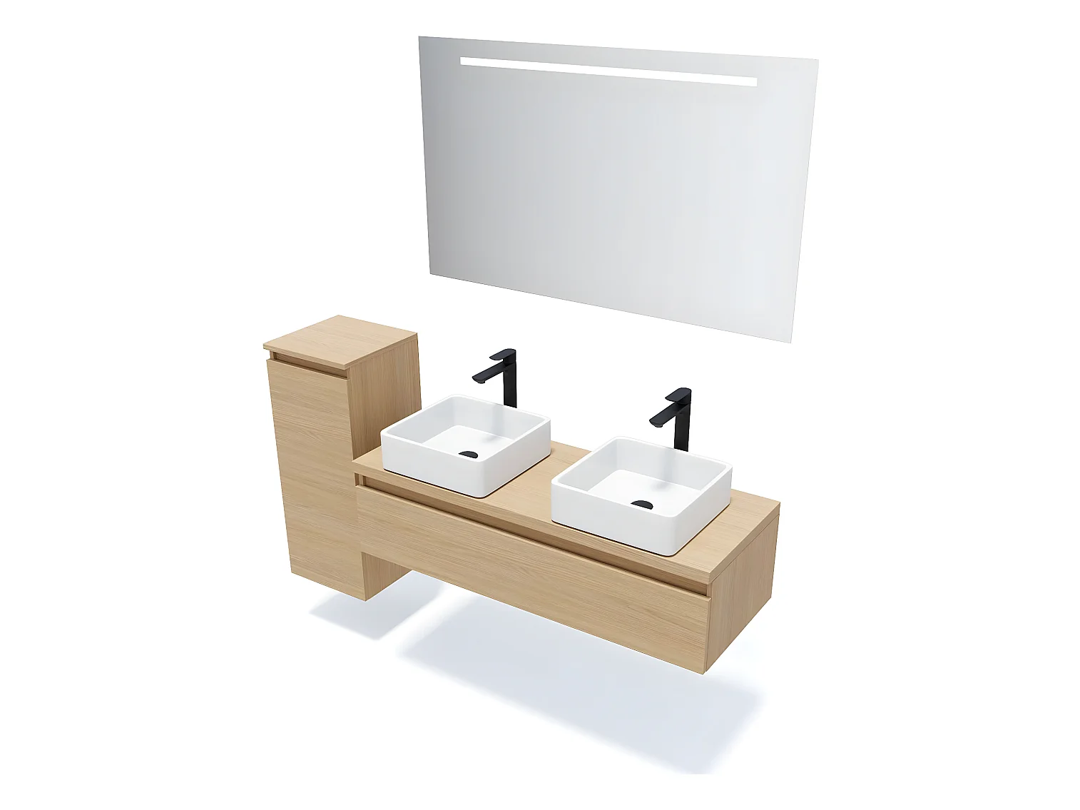 Meuble de salle de bain suspendu 2 vasques à poser 120cm 1 tiroir Chêne clair + miroir + colonne ouverture gauche - Hudson