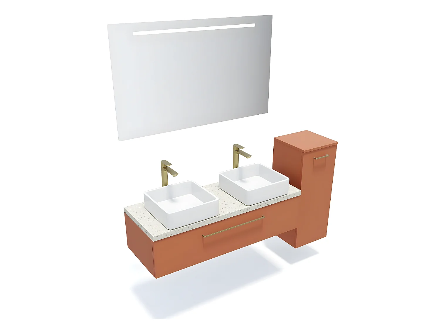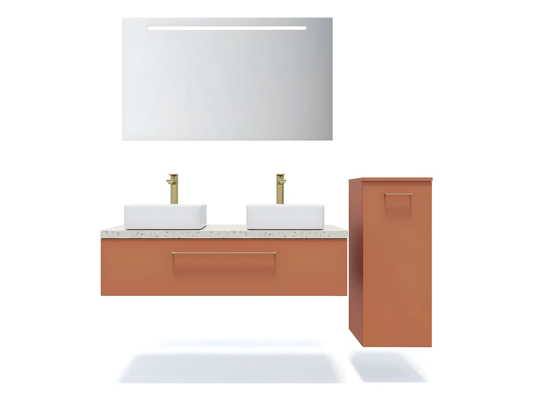 Meuble de salle de bain suspendu 2 vasques à poser 120cm 1 tiroir Terracotta + miroir + colonne ouverture droite - Glasgow