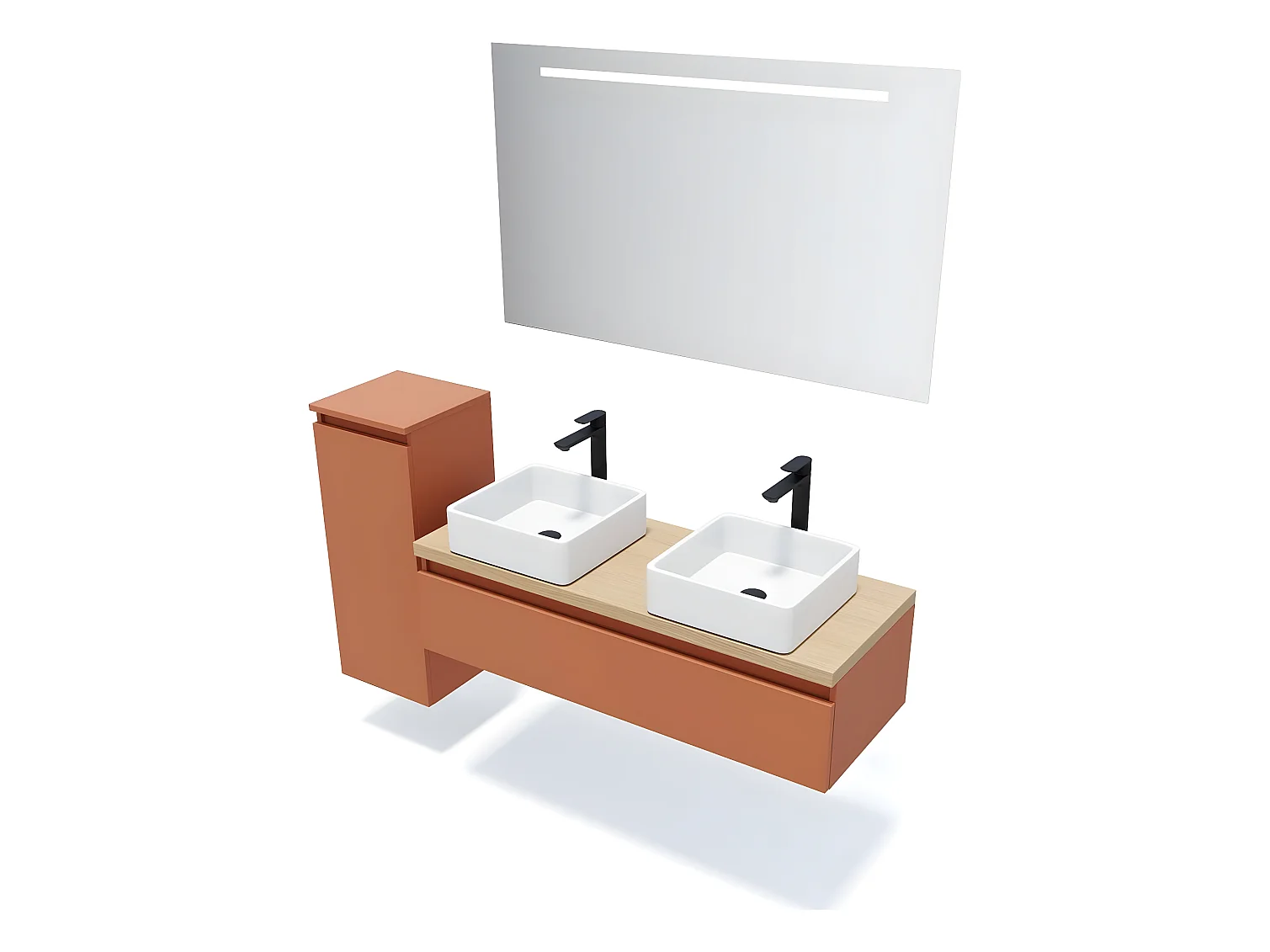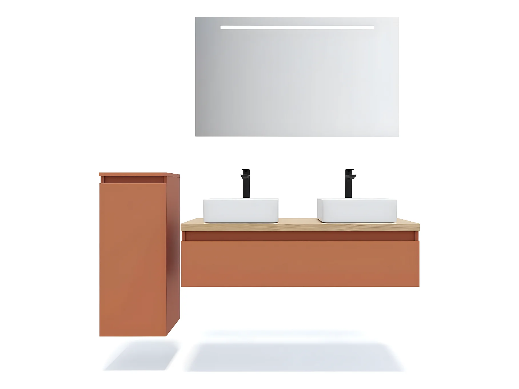 Meuble de salle de bain suspendu 2 vasques à poser 120cm 1 tiroir Terracotta + miroir + colonne ouverture gauche - Hudson
