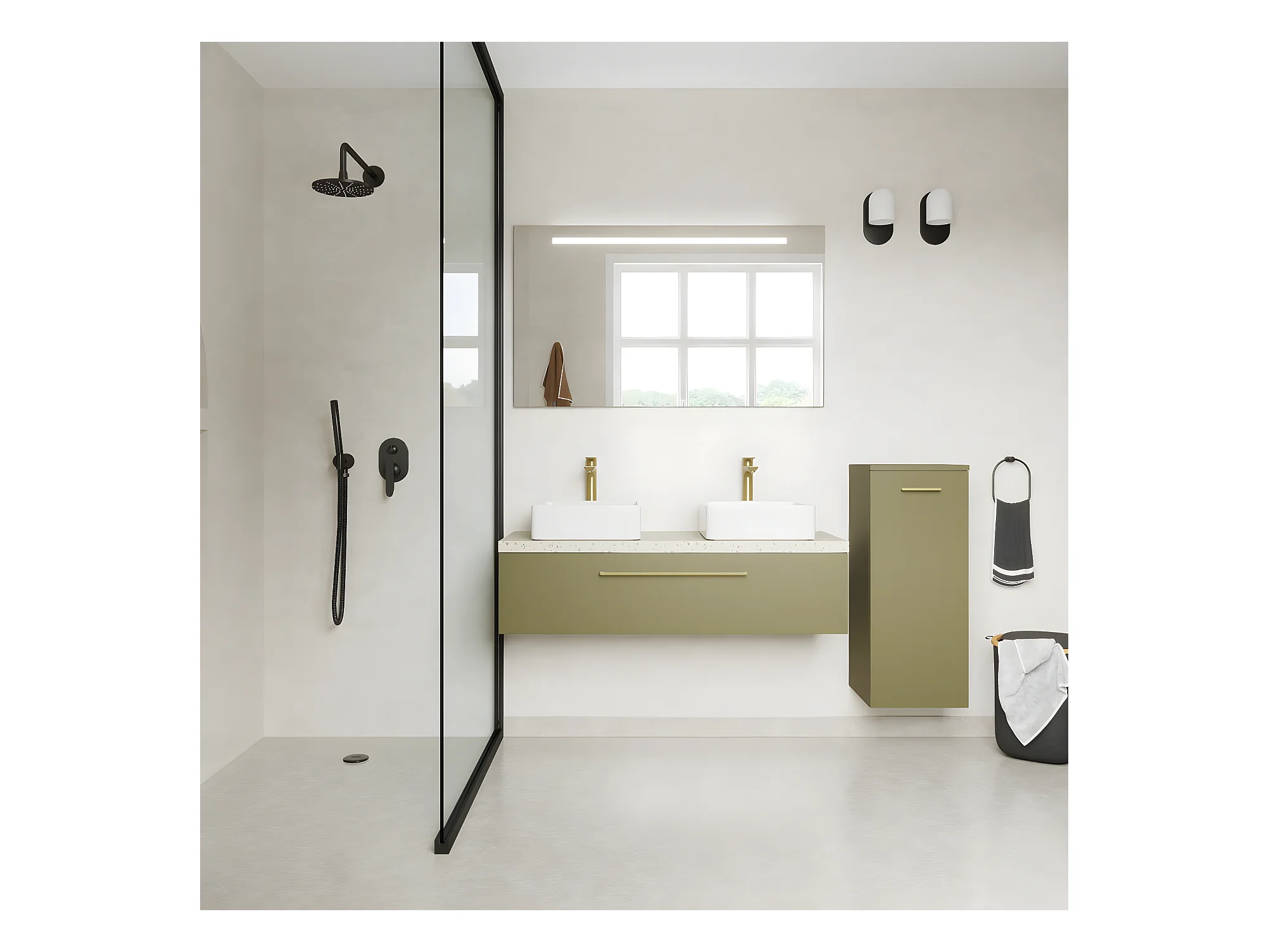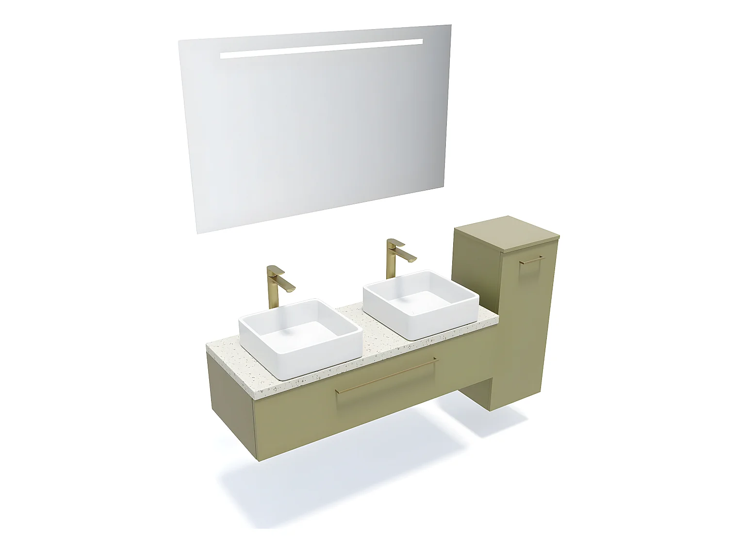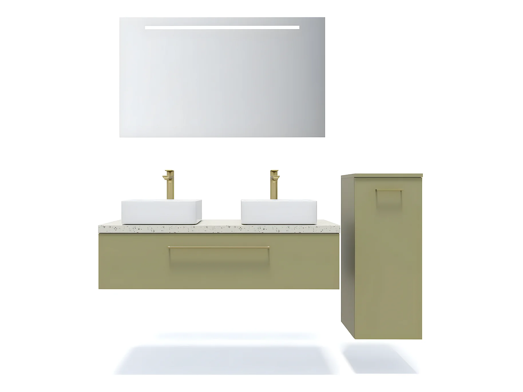 Meuble de salle de bain suspendu 2 vasques à poser 120cm 1 tiroir Vert olive + miroir + colonne ouverture droite - Glasgow