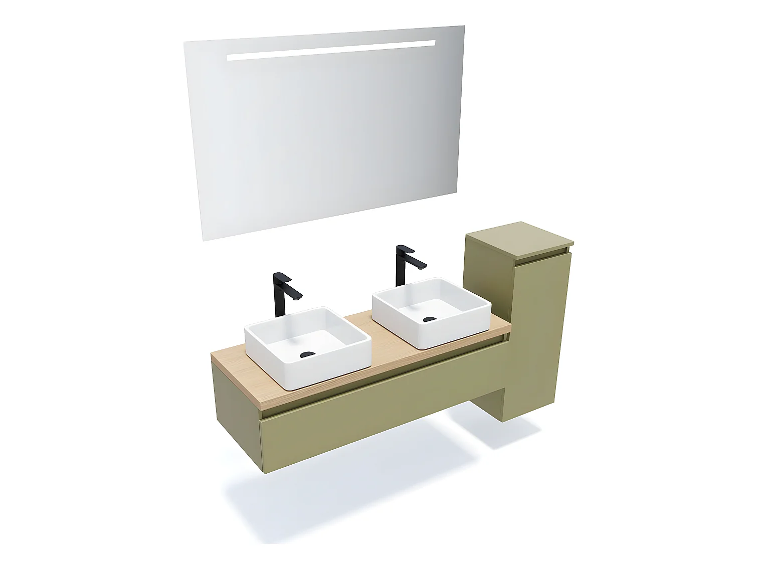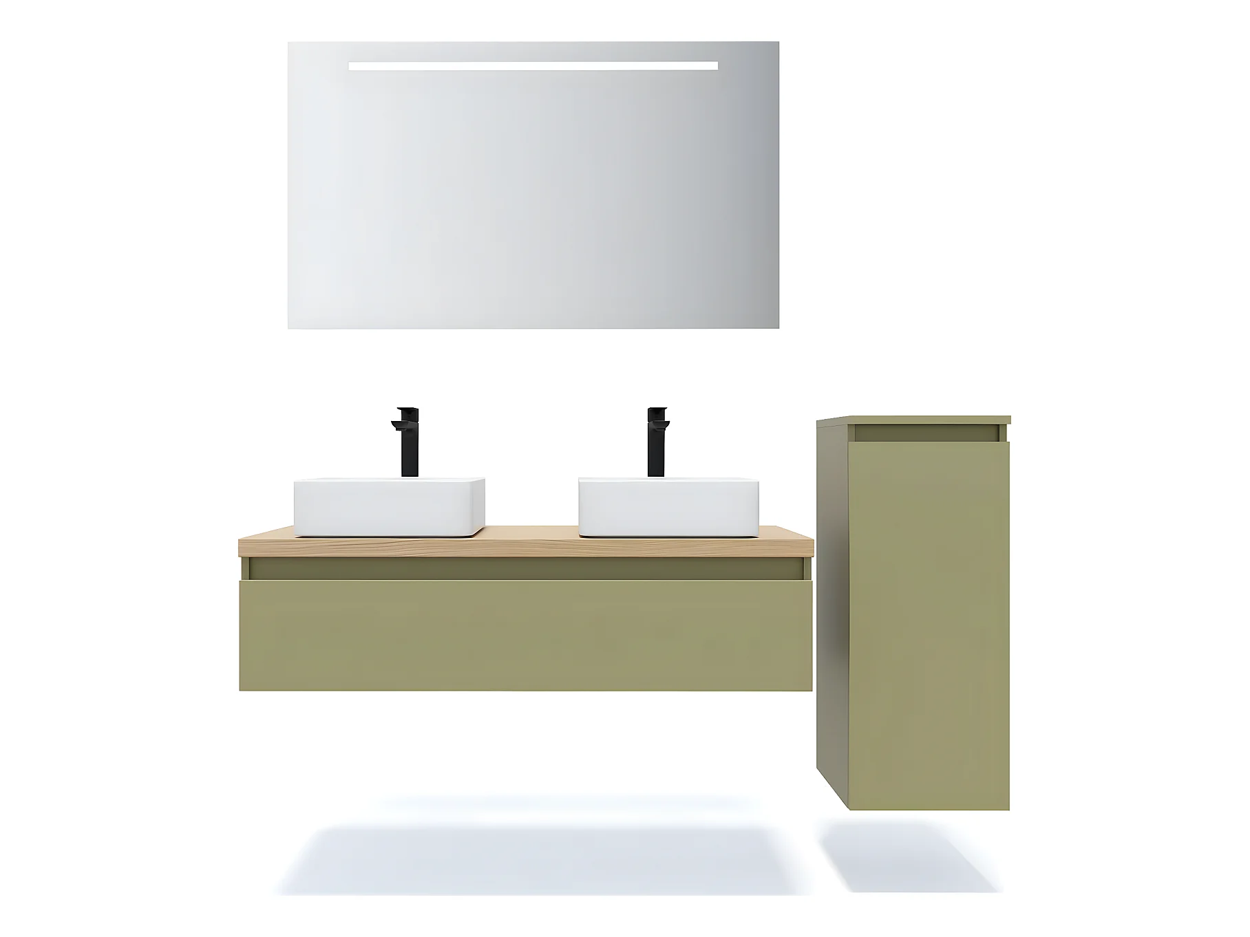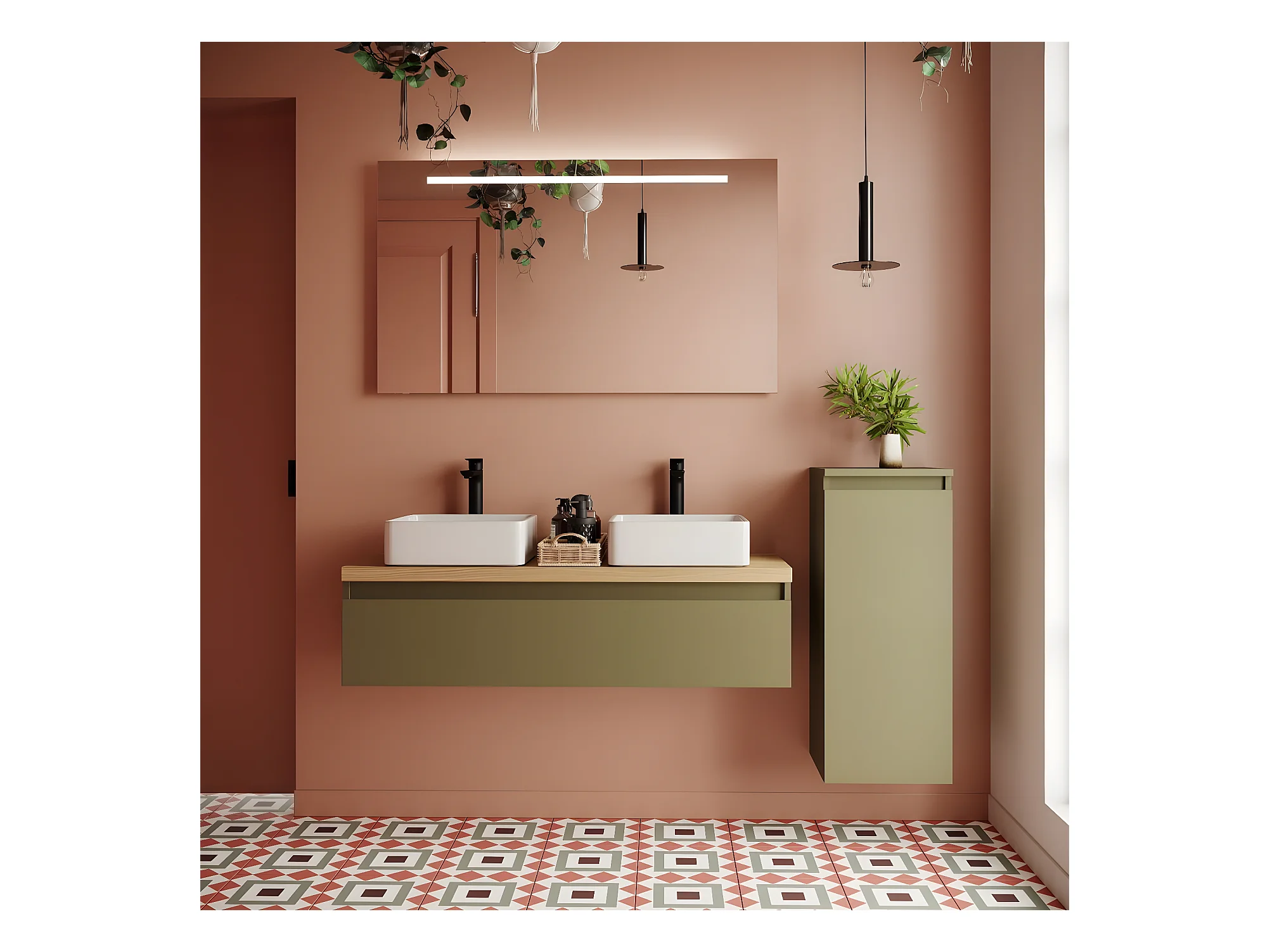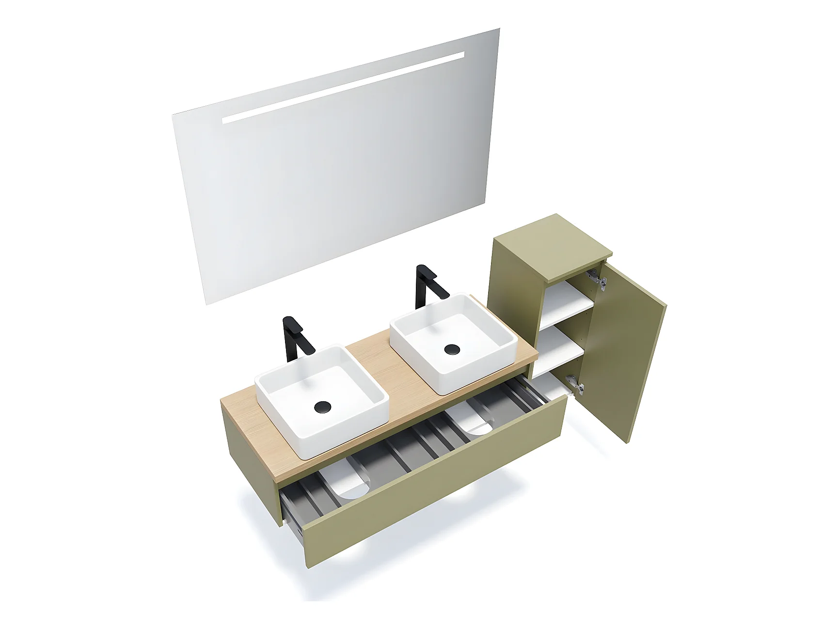 Meuble de salle de bain suspendu 2 vasques à poser 120cm 1 tiroir Vert olive + miroir + colonne ouverture droite - Hudson