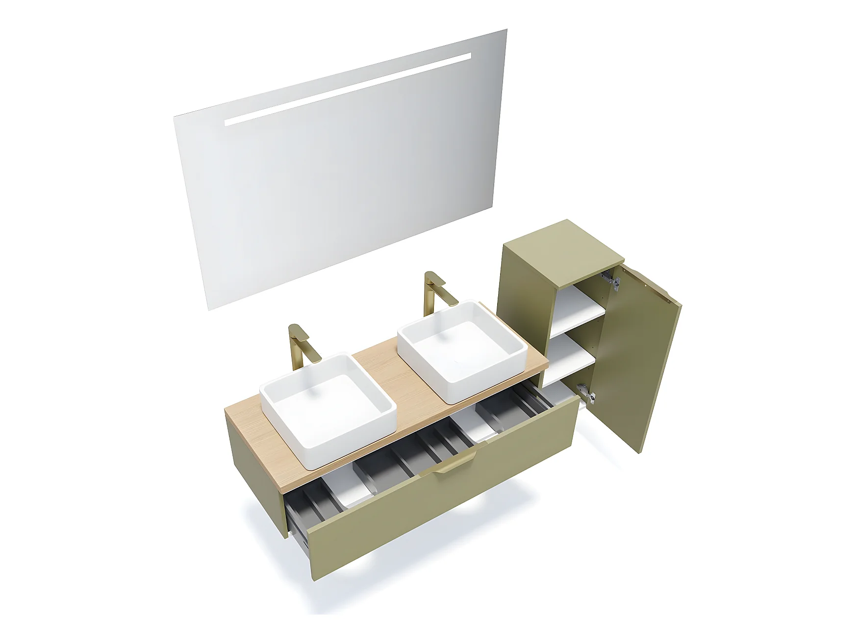 Meuble de salle de bain suspendu 2 vasques à poser 120cm 1 tiroir Vert olive + miroir + colonne ouverture droite - Venice