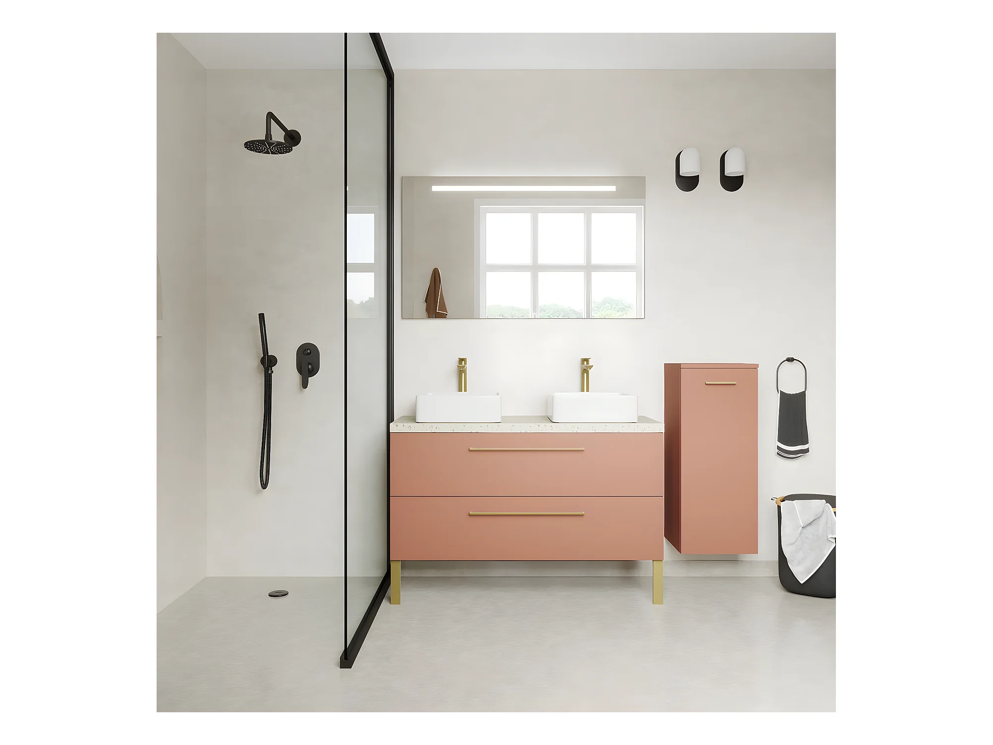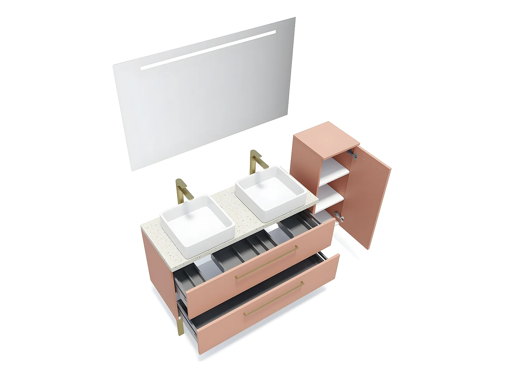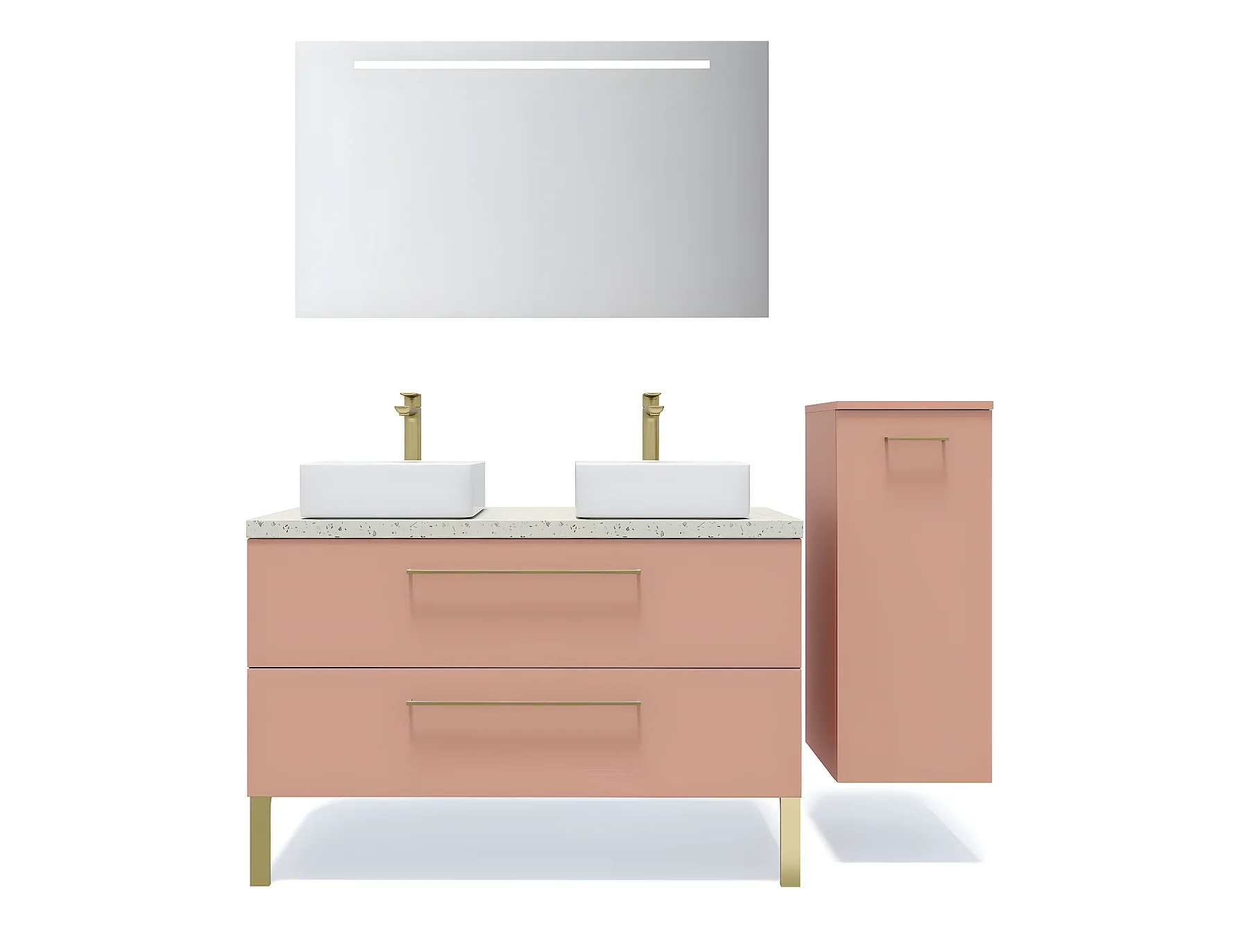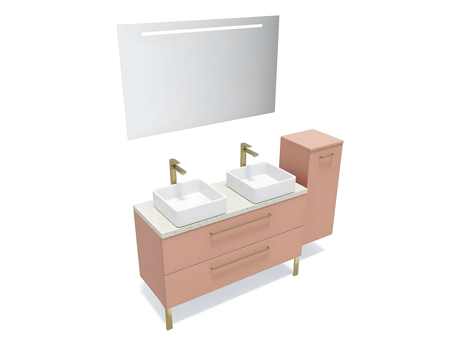 Meuble de salle de bain suspendu 2 vasques à poser 120cm 2 tiroirs Abricot + miroir + colonne ouverture droite - Glasgow