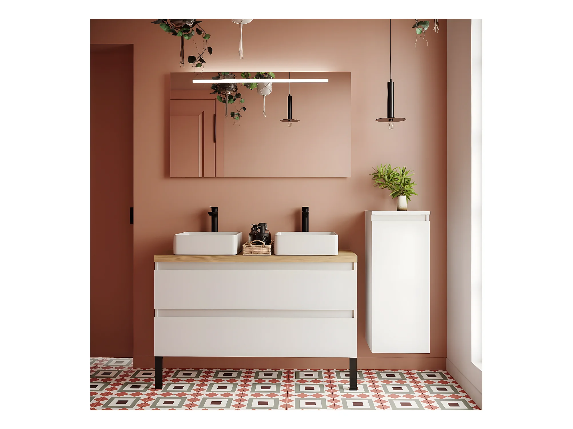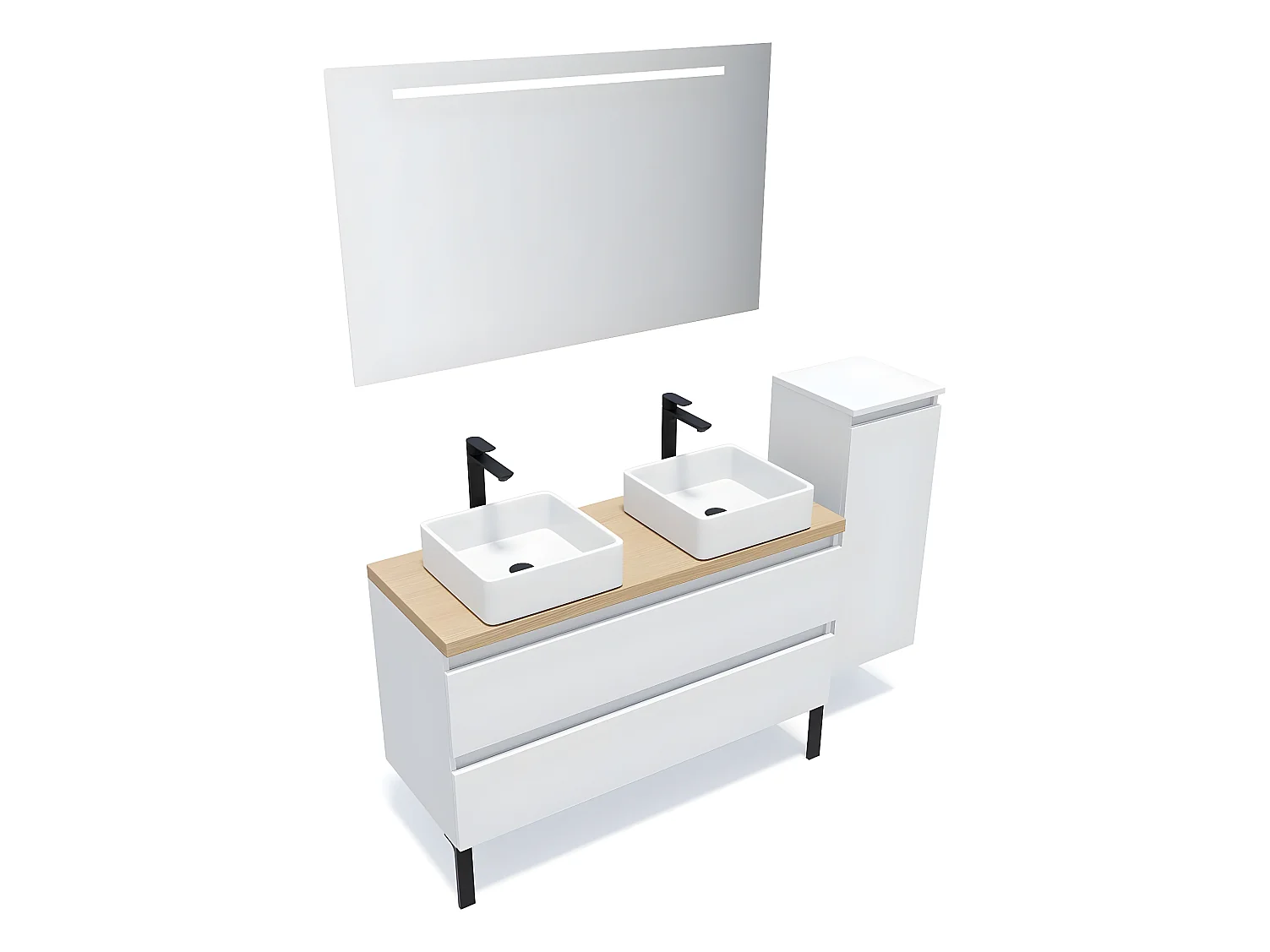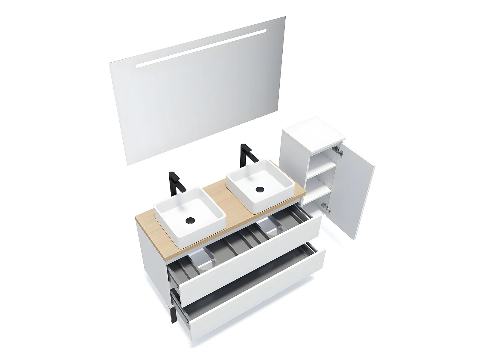 Meuble de salle de bain suspendu 2 vasques à poser 120cm 2 tiroirs Blanc + miroir + colonne ouverture droite - Hudson