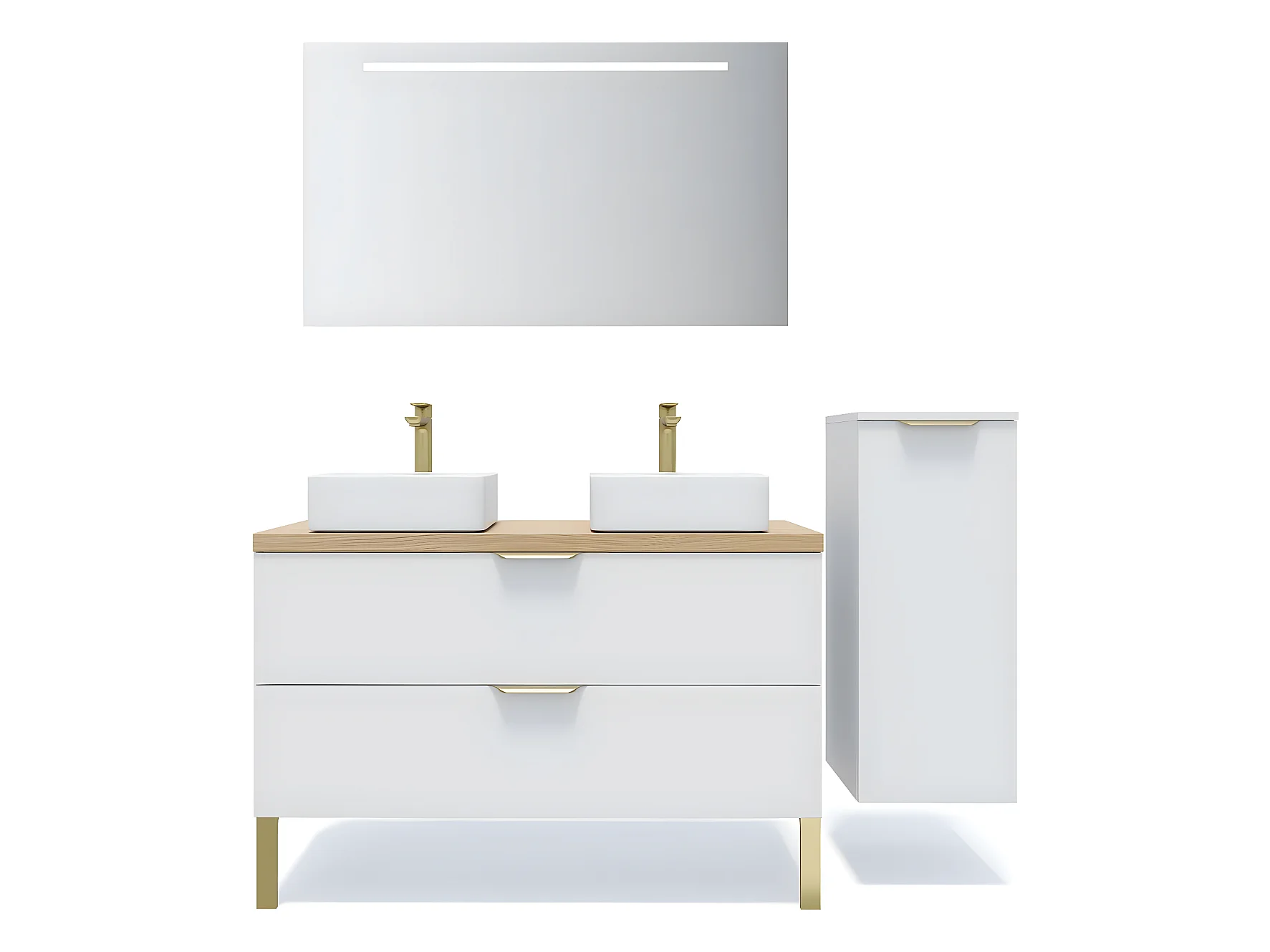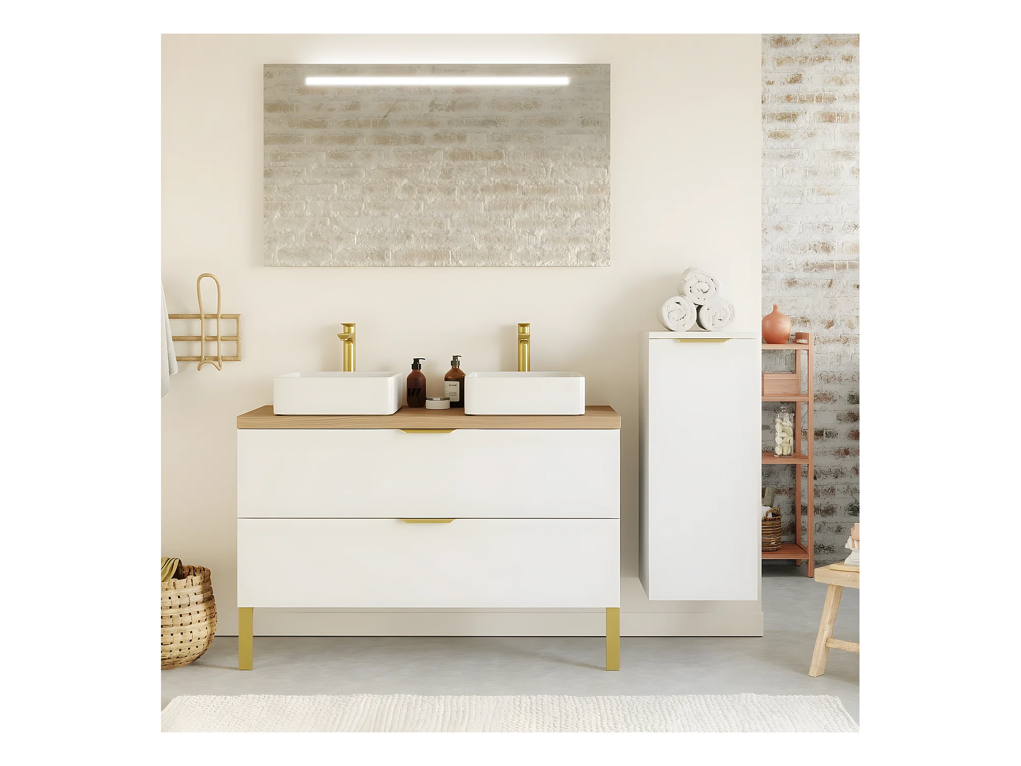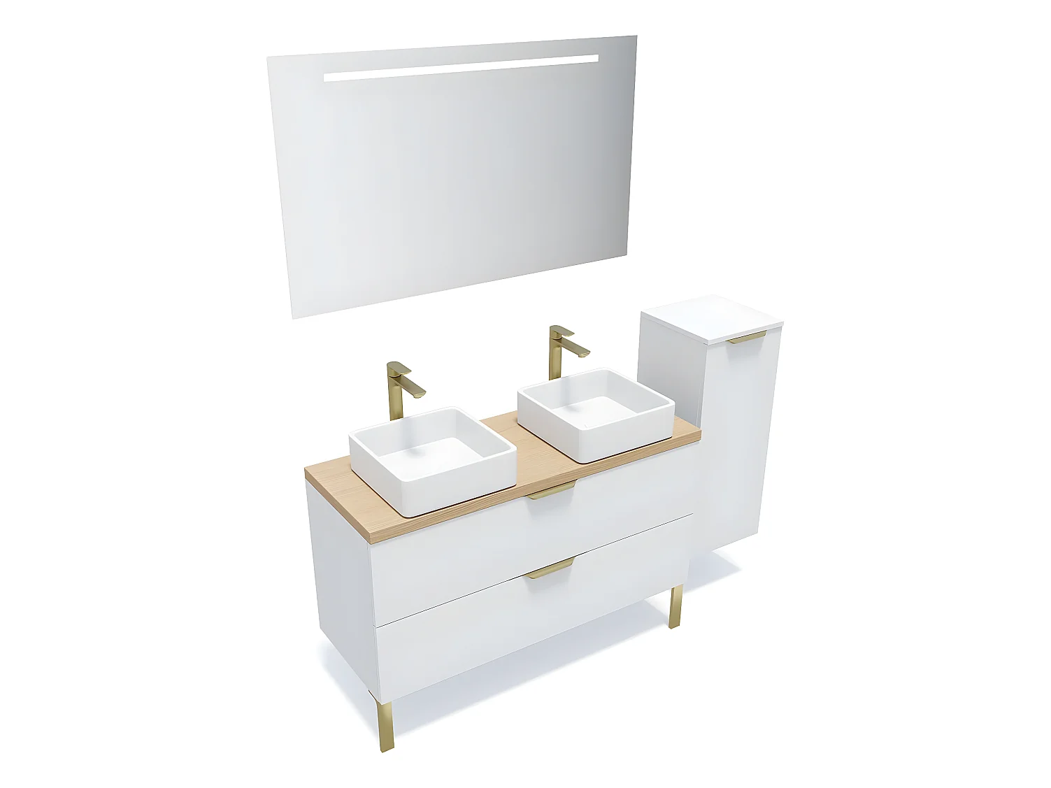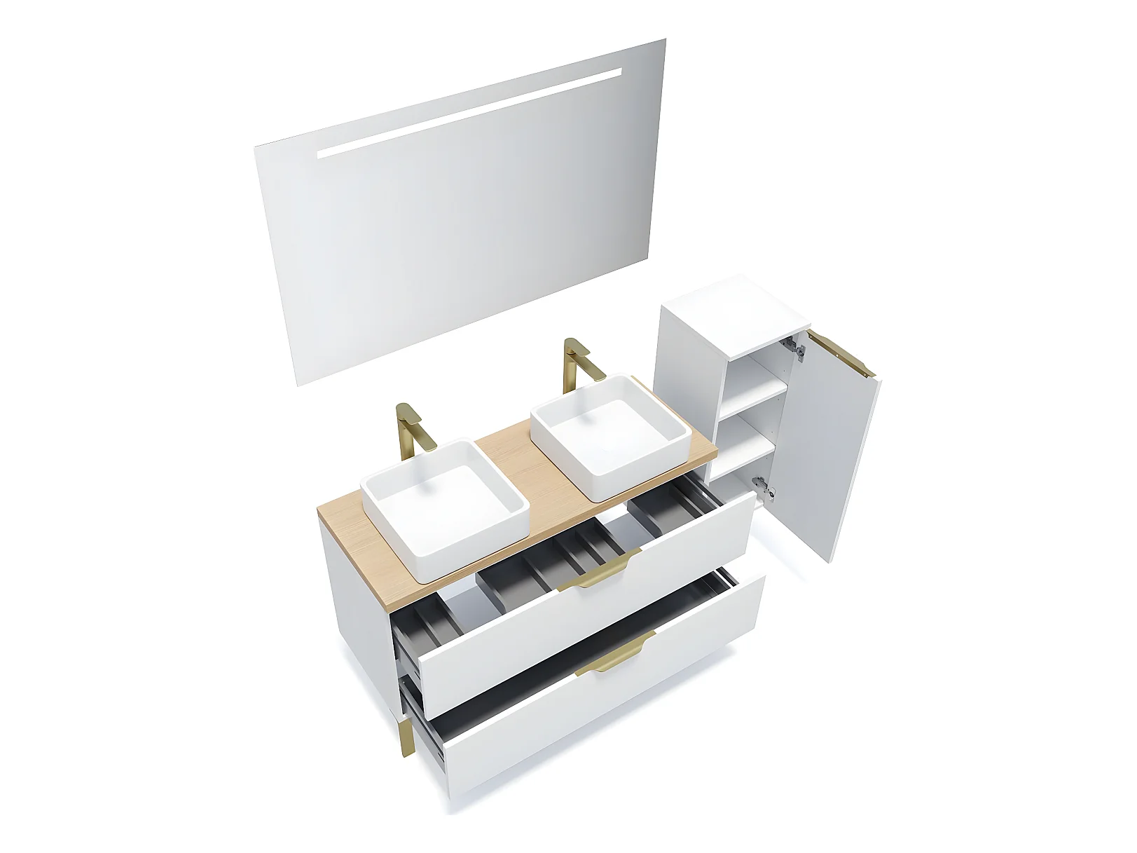 Meuble de salle de bain suspendu 2 vasques à poser 120cm 2 tiroirs Blanc + miroir + colonne ouverture droite - Venice