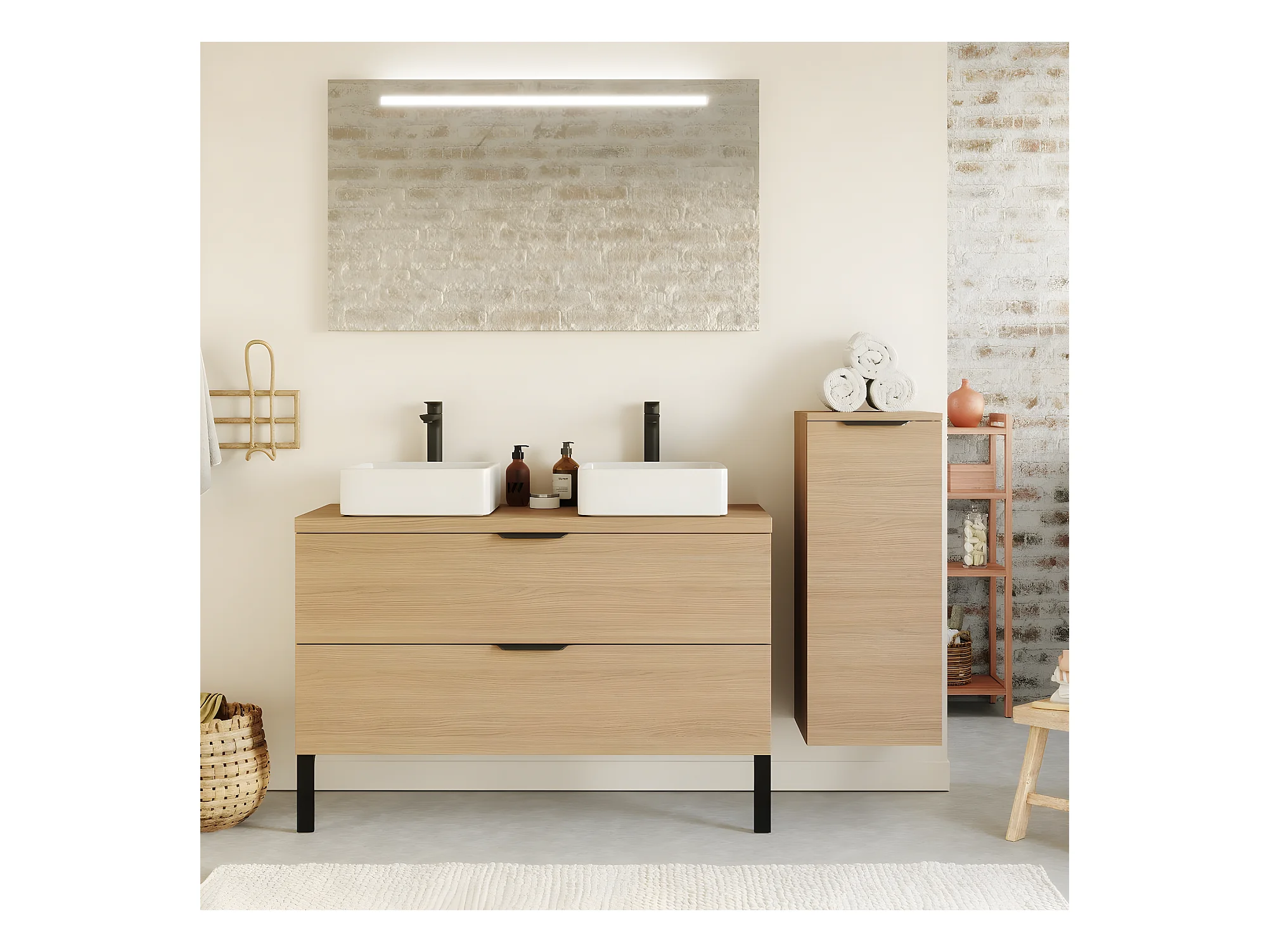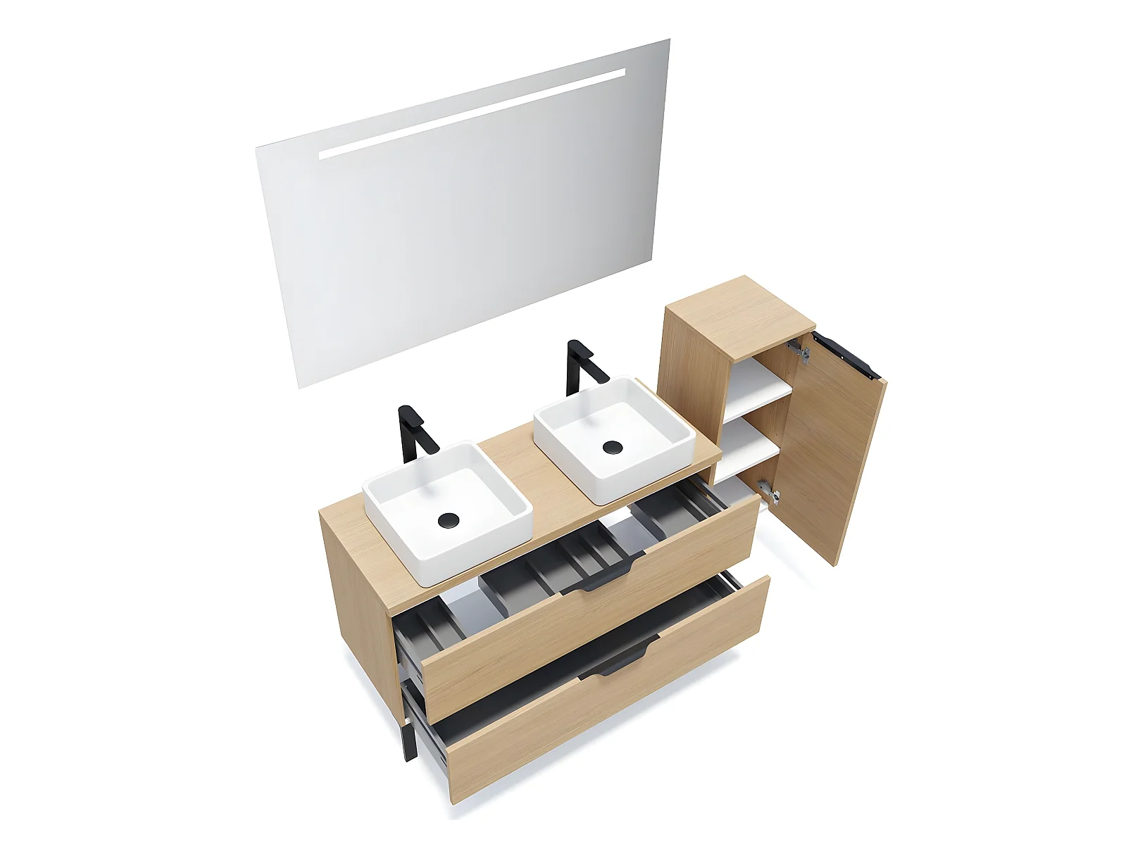 Meuble de salle de bain suspendu 2 vasques à poser 120cm 2 tiroirs Chêne clair + miroir + colonne ouverture droite - Venice