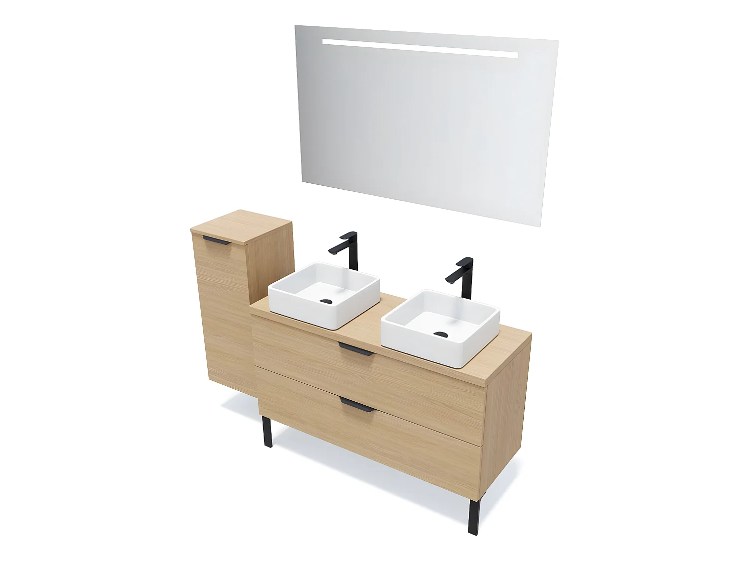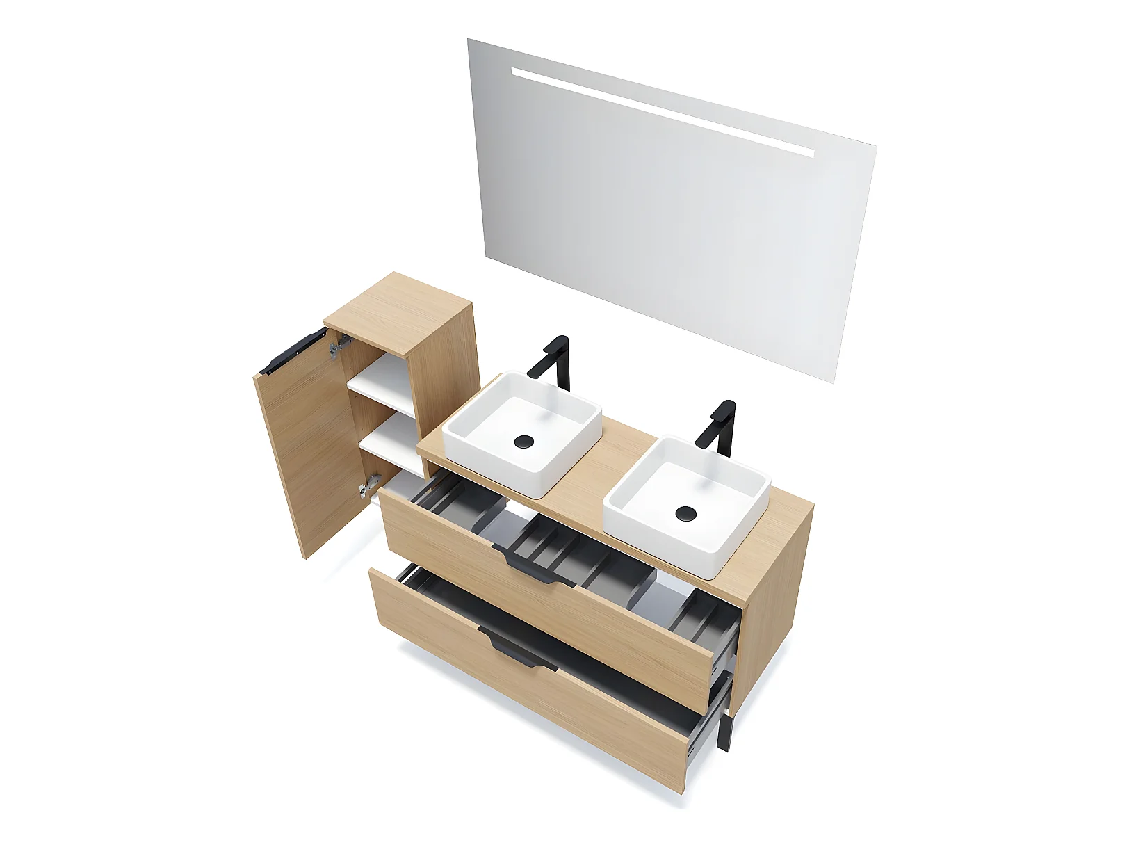 Meuble de salle de bain suspendu 2 vasques à poser 120cm 2 tiroirs Chêne clair + miroir + colonne ouverture gauche - Venice