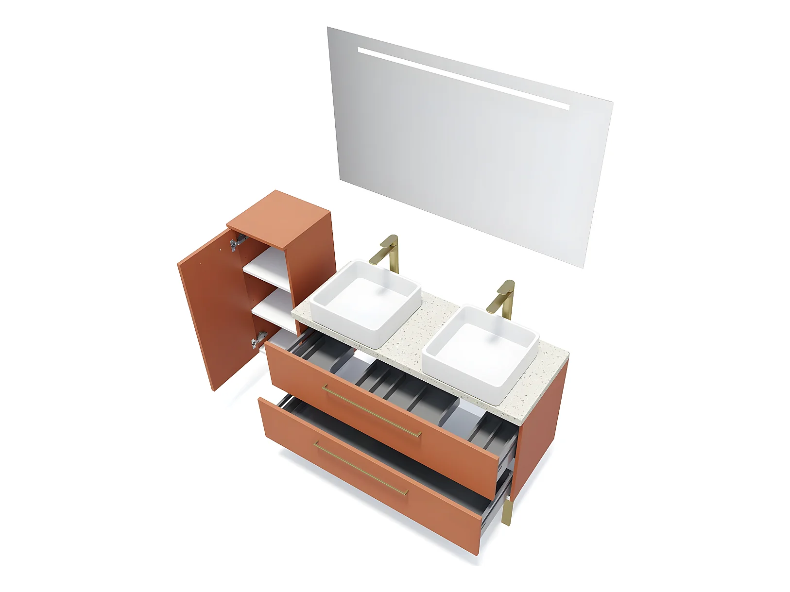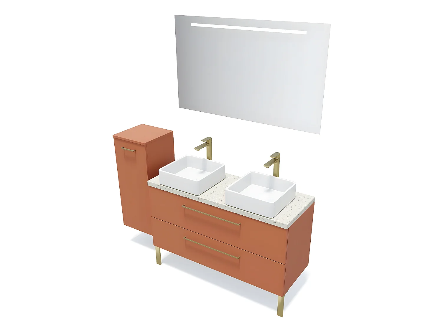 Meuble de salle de bain suspendu 2 vasques à poser 120cm 2 tiroirs Terracotta + miroir + colonne ouverture gauche - Glasgow