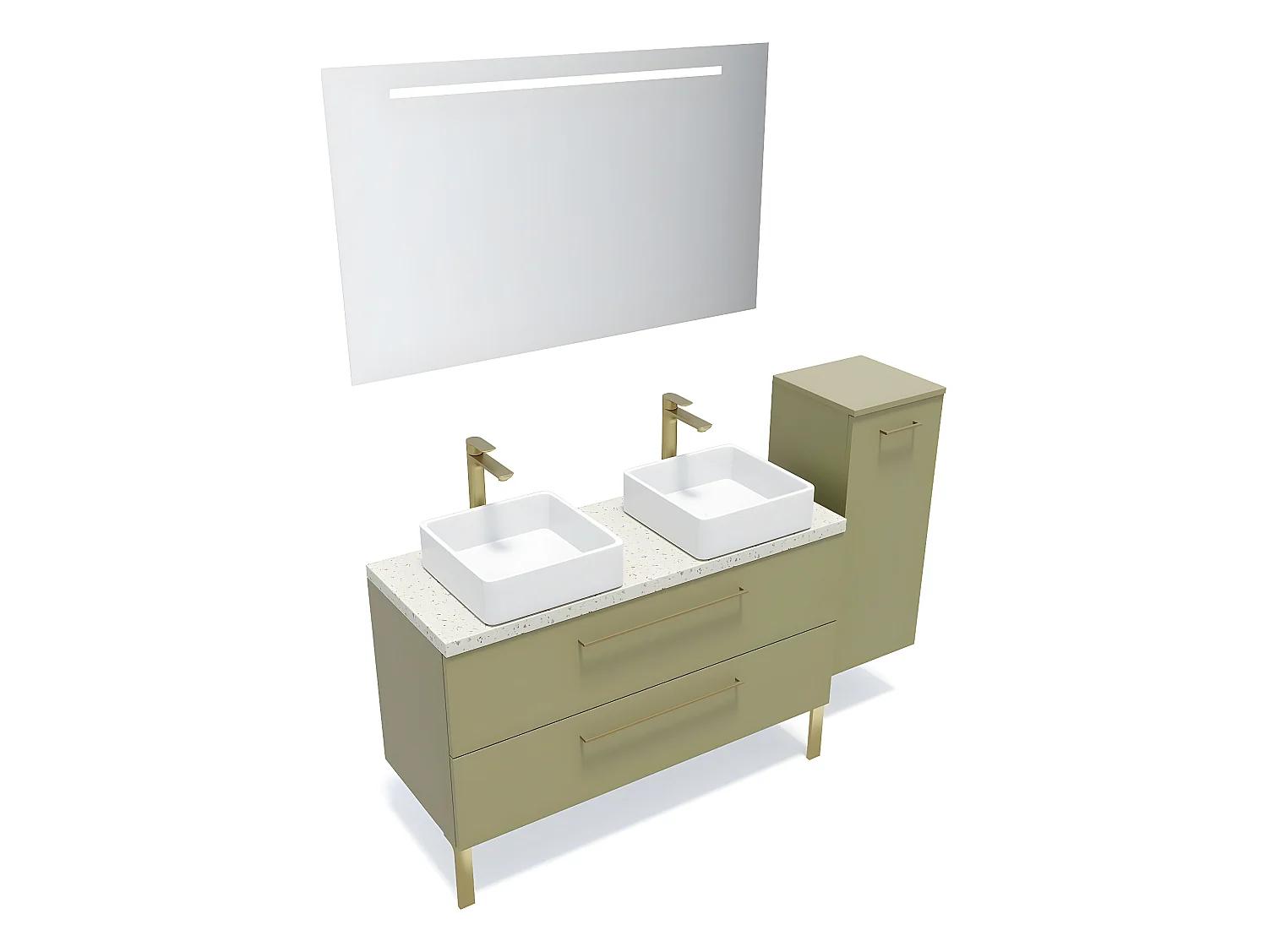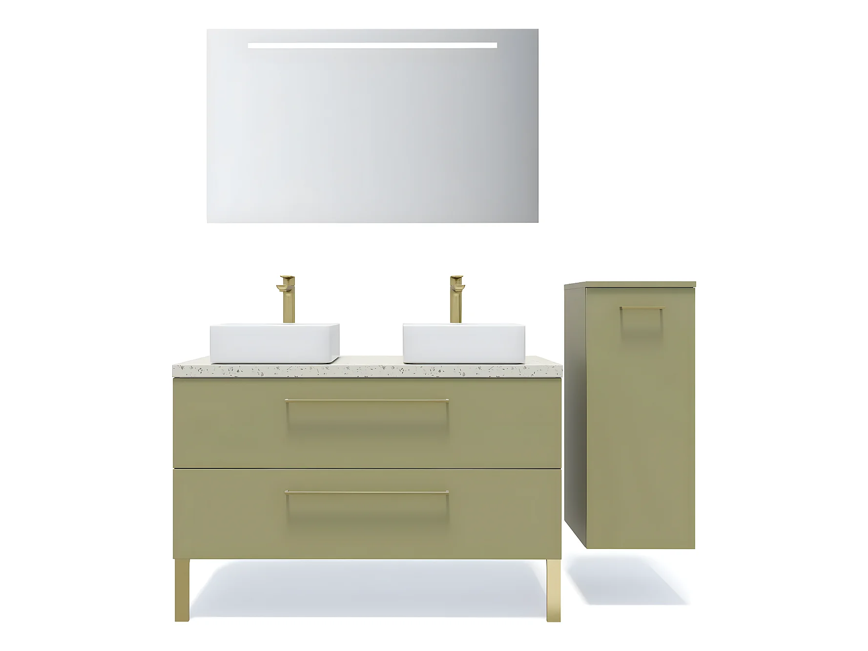 Meuble de salle de bain suspendu 2 vasques à poser 120cm 2 tiroirs Vert olive + miroir + colonne ouverture droite - Glasgow