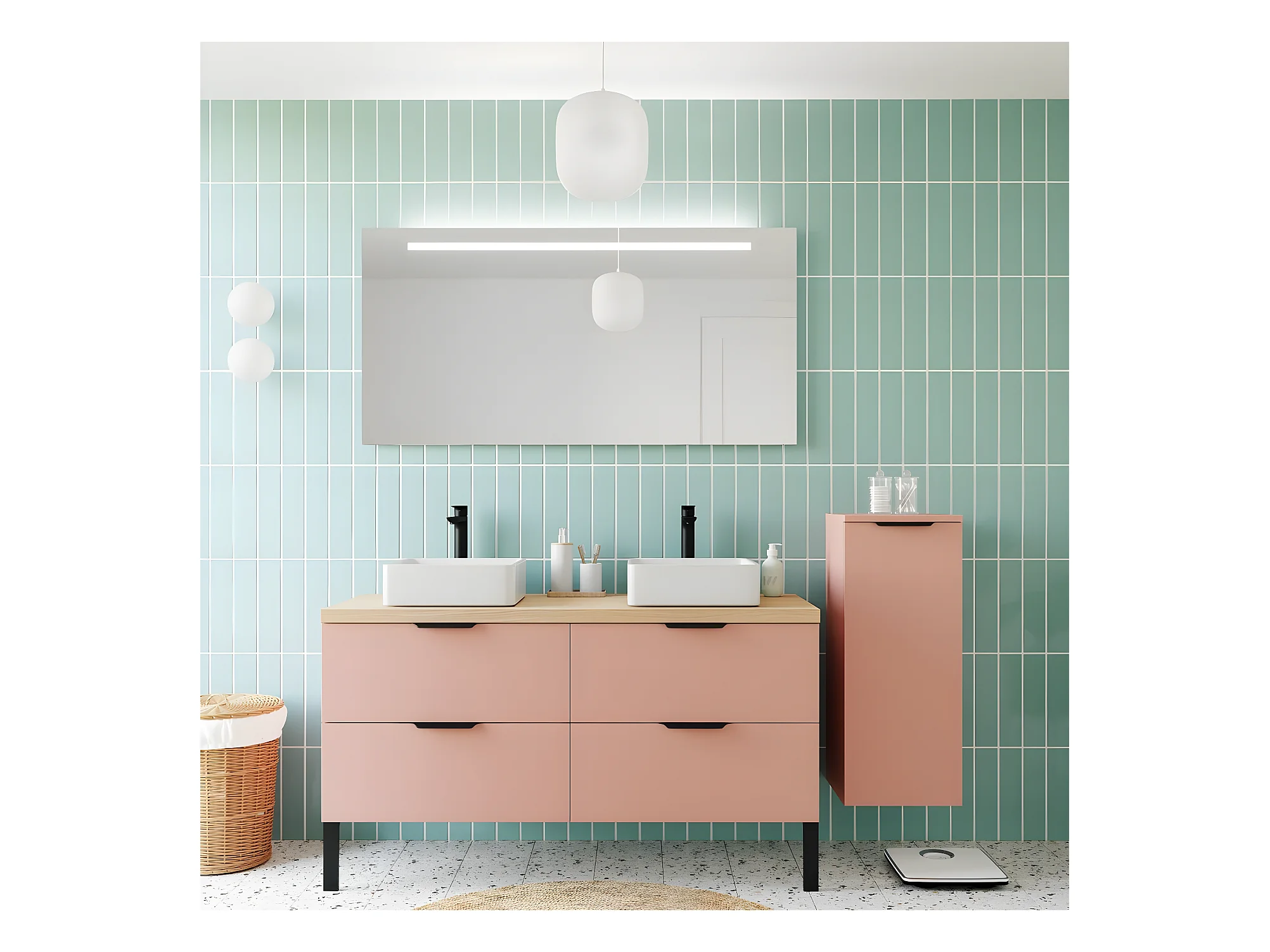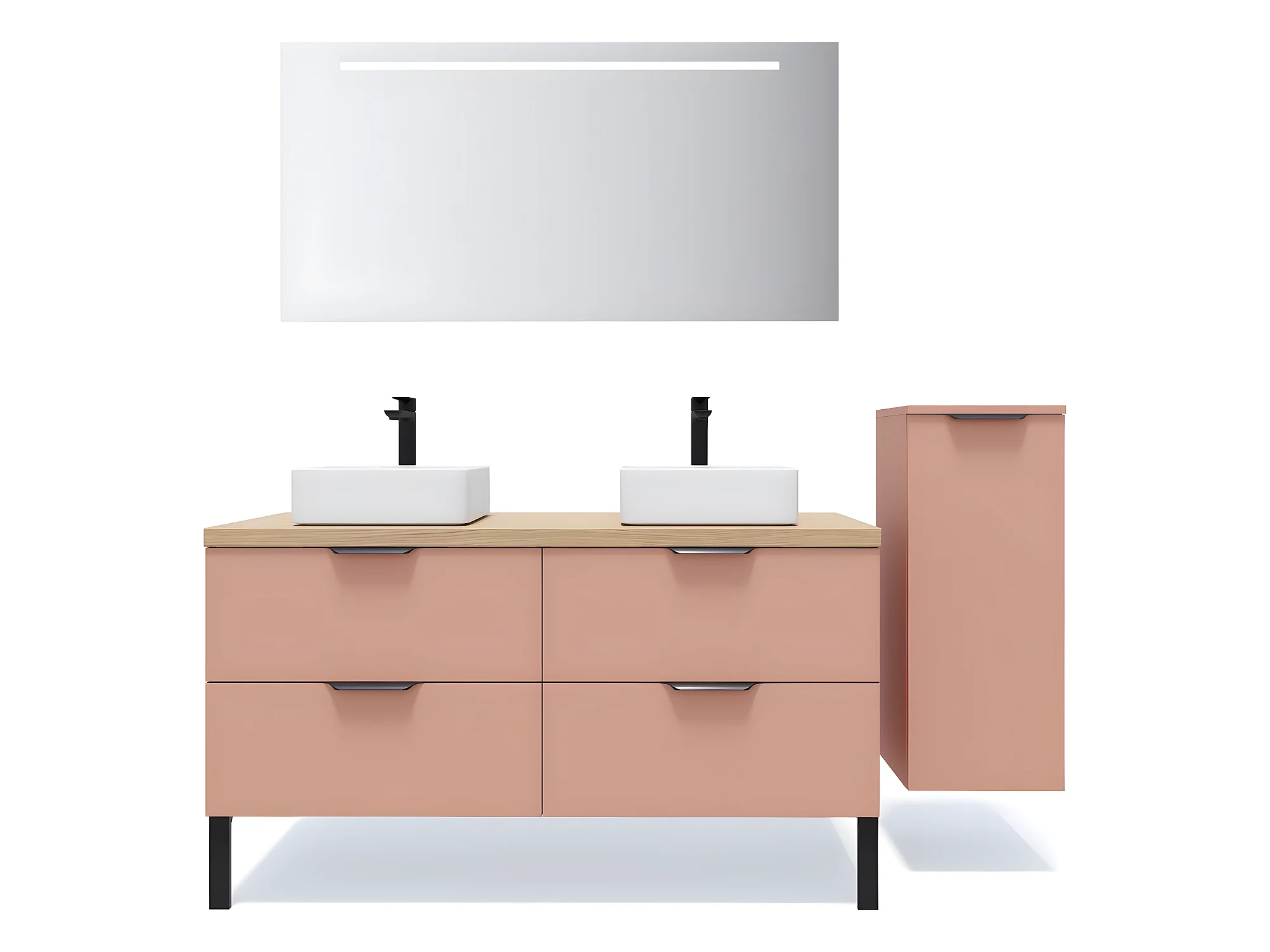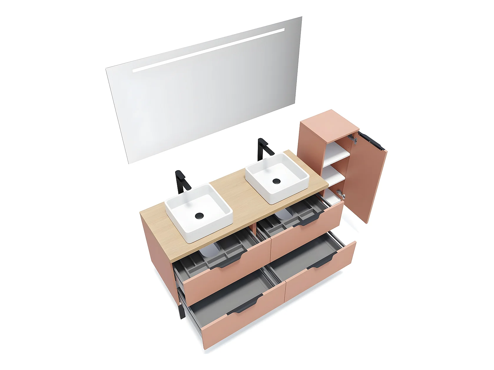 Meuble de salle de bain suspendu 2 vasques à poser 140cm 4 tiroirs Abricot + miroir + colonne ouverture droite - Soho