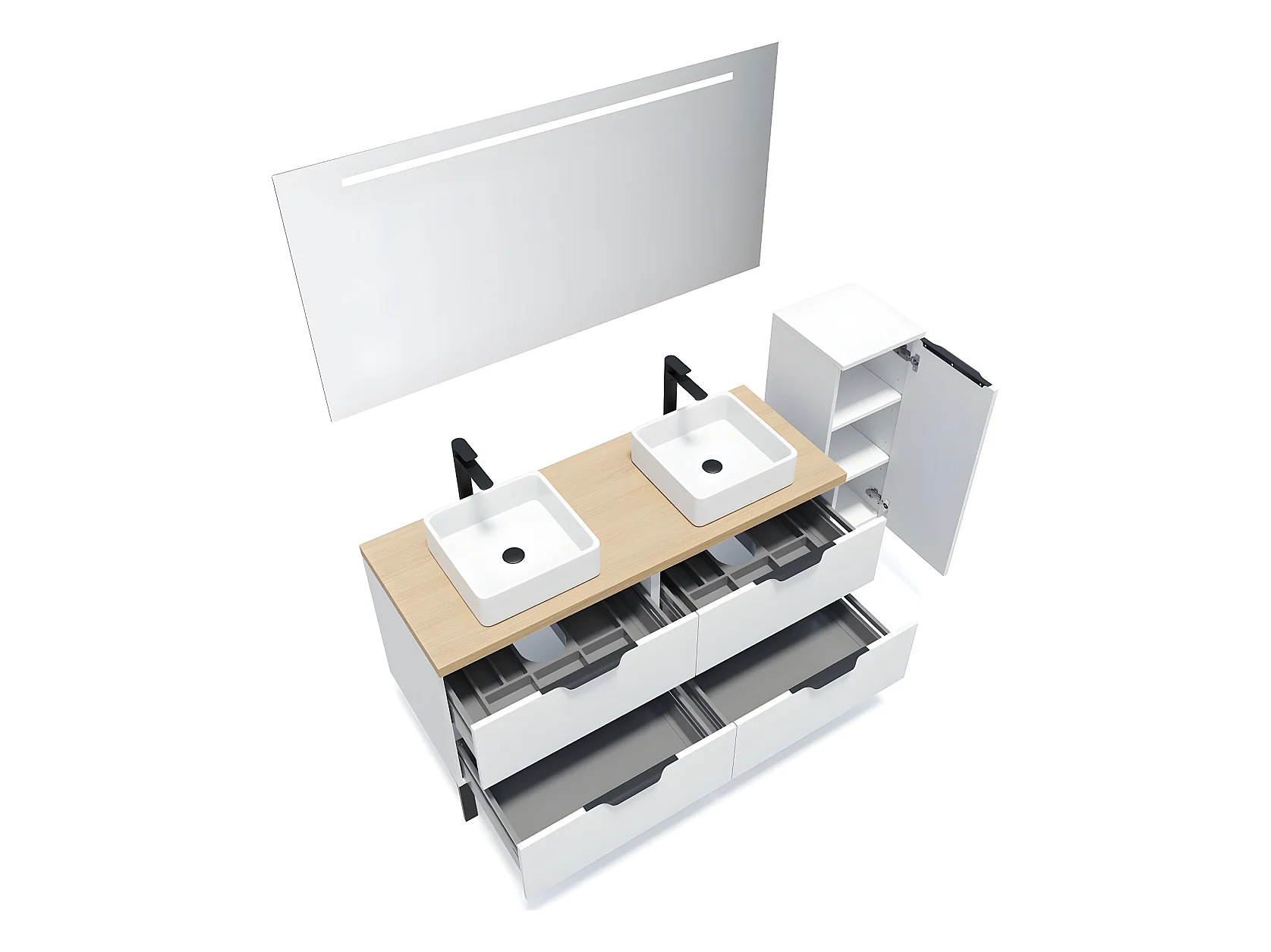 Meuble de salle de bain suspendu 2 vasques à poser 140cm 4 tiroirs Blanc + miroir + colonne ouverture droite - Soho