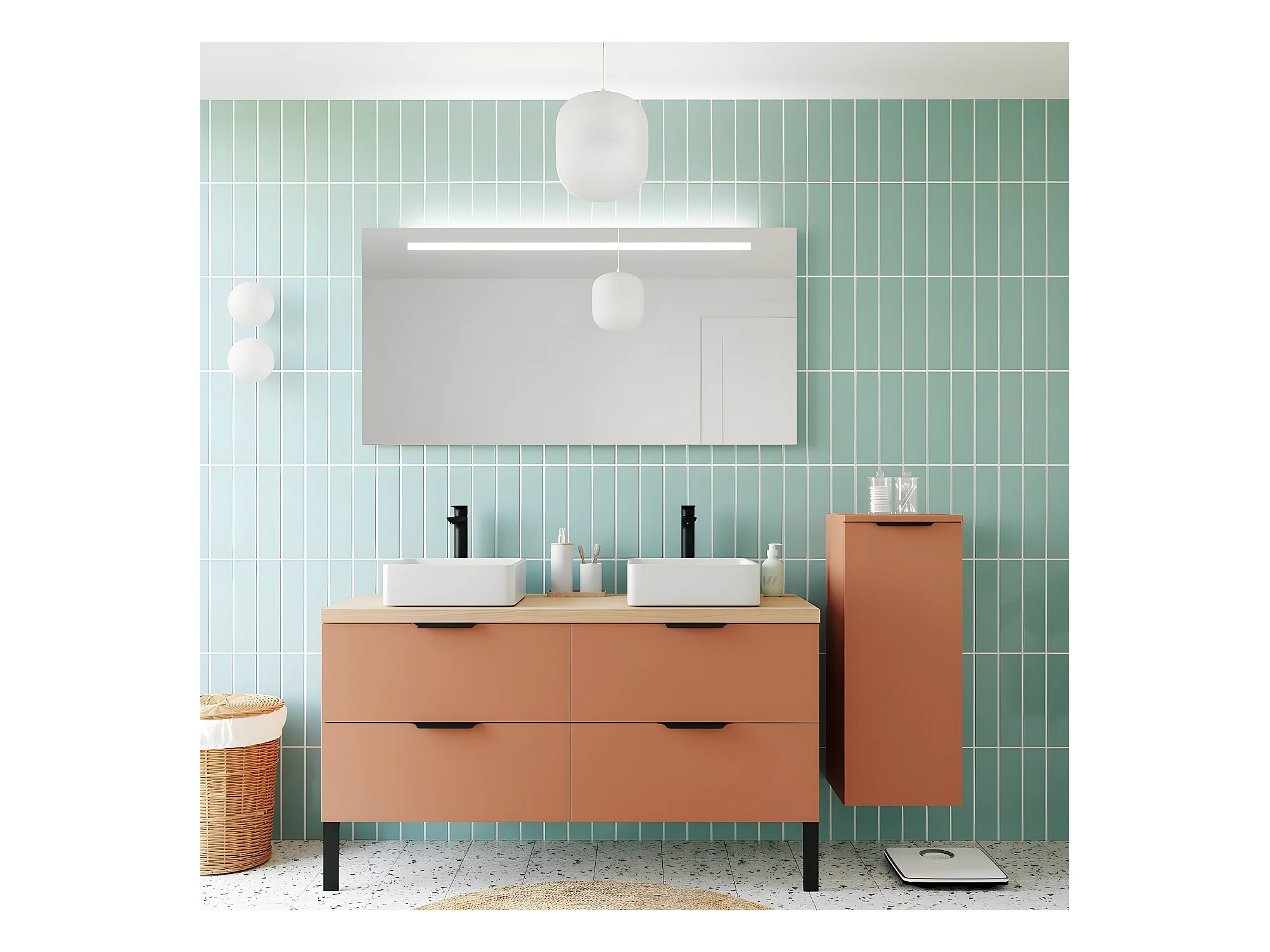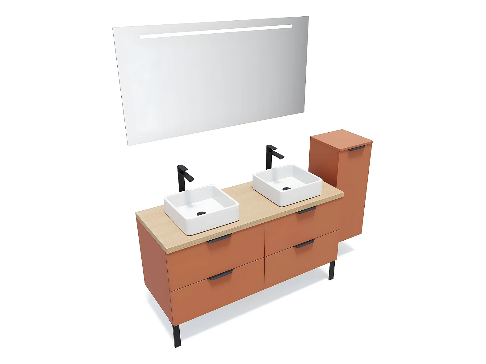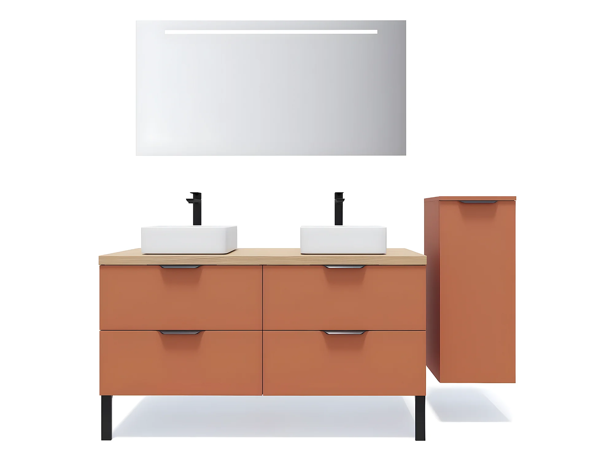 Meuble de salle de bain suspendu 2 vasques à poser 140cm 4 tiroirs Terracotta + miroir + colonne ouverture droite - Soho